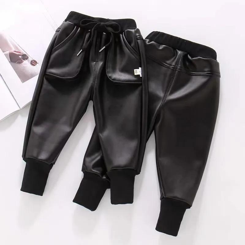 Детские кожаные штаны осень-зима плюс бархат утолщенные теплые и ветрозащитные кожаные штаны водонепроницаемые детские штаны на шнурке