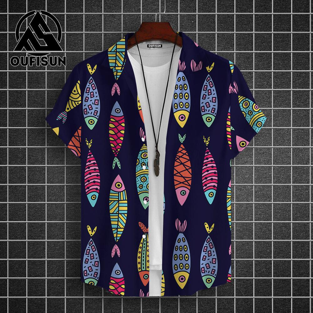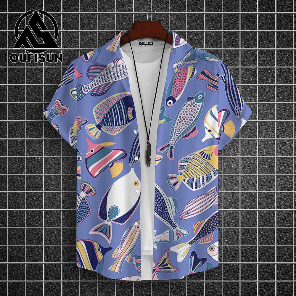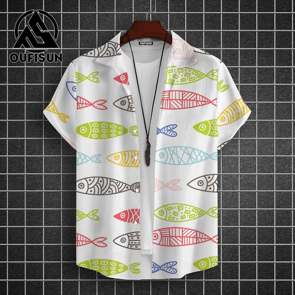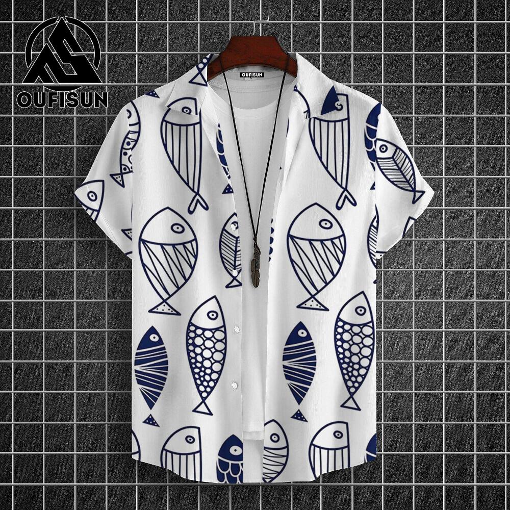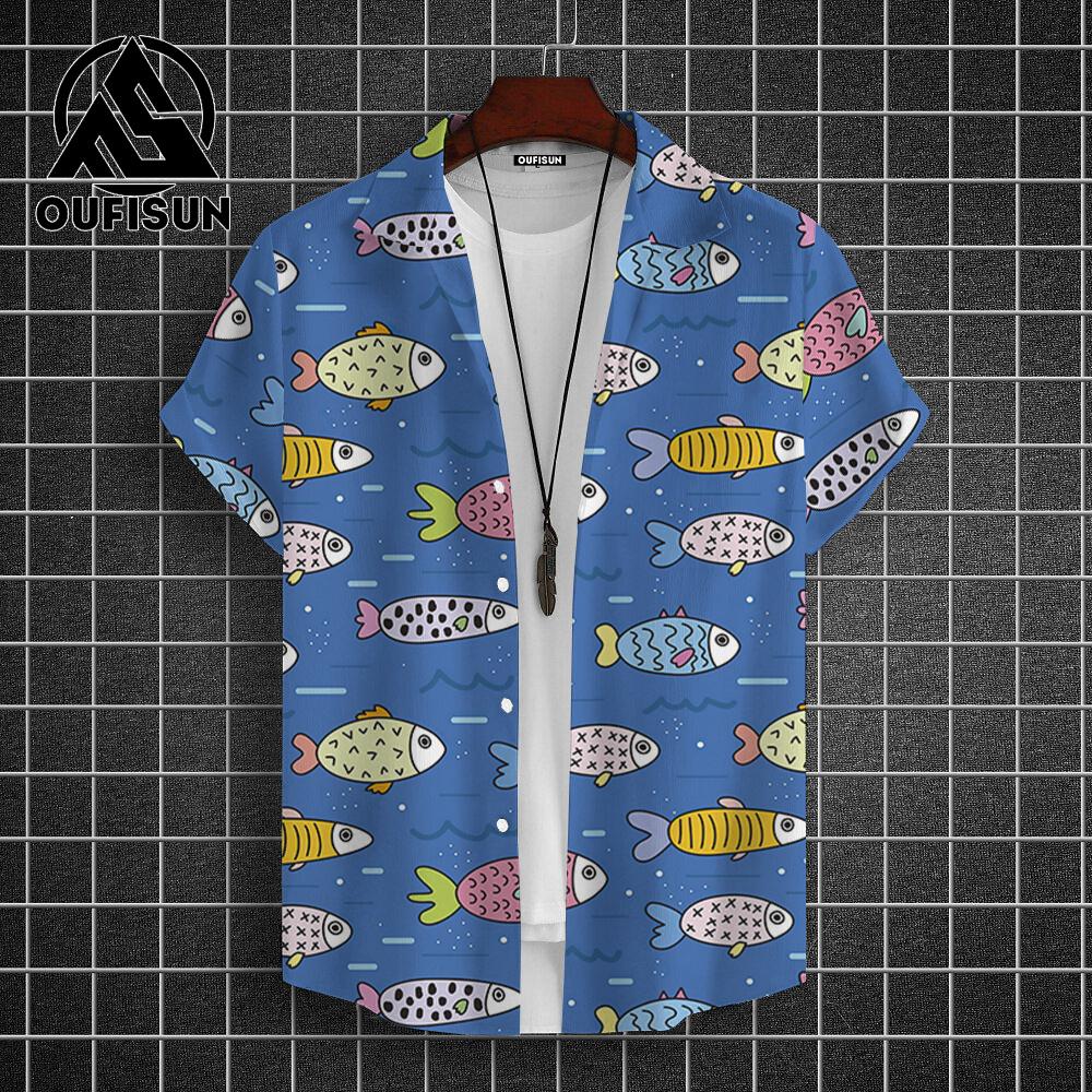 Гавайская рубашка для мужчин, пляжная повседневная мужская рубашка с коротким рукавом, новая симпатичная мужская рубашка с 3D-принтом в виде рыбки, свободная мужская одежда 5xl