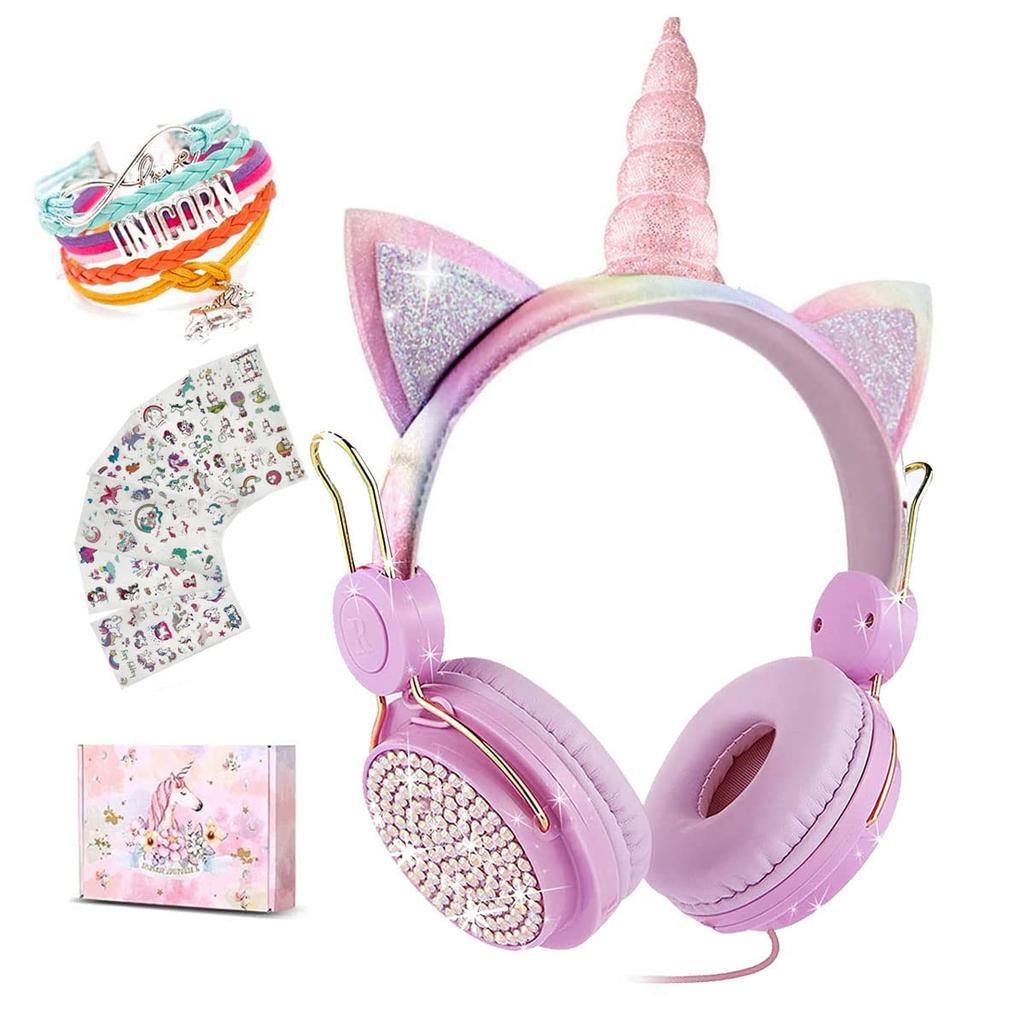 【Дизайн в виде кошачьих ушей-единорога — детям очень понравится】 Эта розовая гарнитура в форме кошачьих и единороговых ушей выполнена из блестящей искусственной кожи цвета единорога.. В то же время корпус наушников полностью усыпан блестящими стразами, что выглядит очень мило и очаровательно.. В комплекте подарочная коробка с рисунком единорога и наклейки-татуировки с героями мультфильмов. (Узор единорога x 2, Рождественский узор x 1, Хэллоуинский узор x 1, Пасхальный узор x 1), и плетеный браслет в виде единорога. Подарочная коробка, полная любви, любимая вещь каждой девушки.