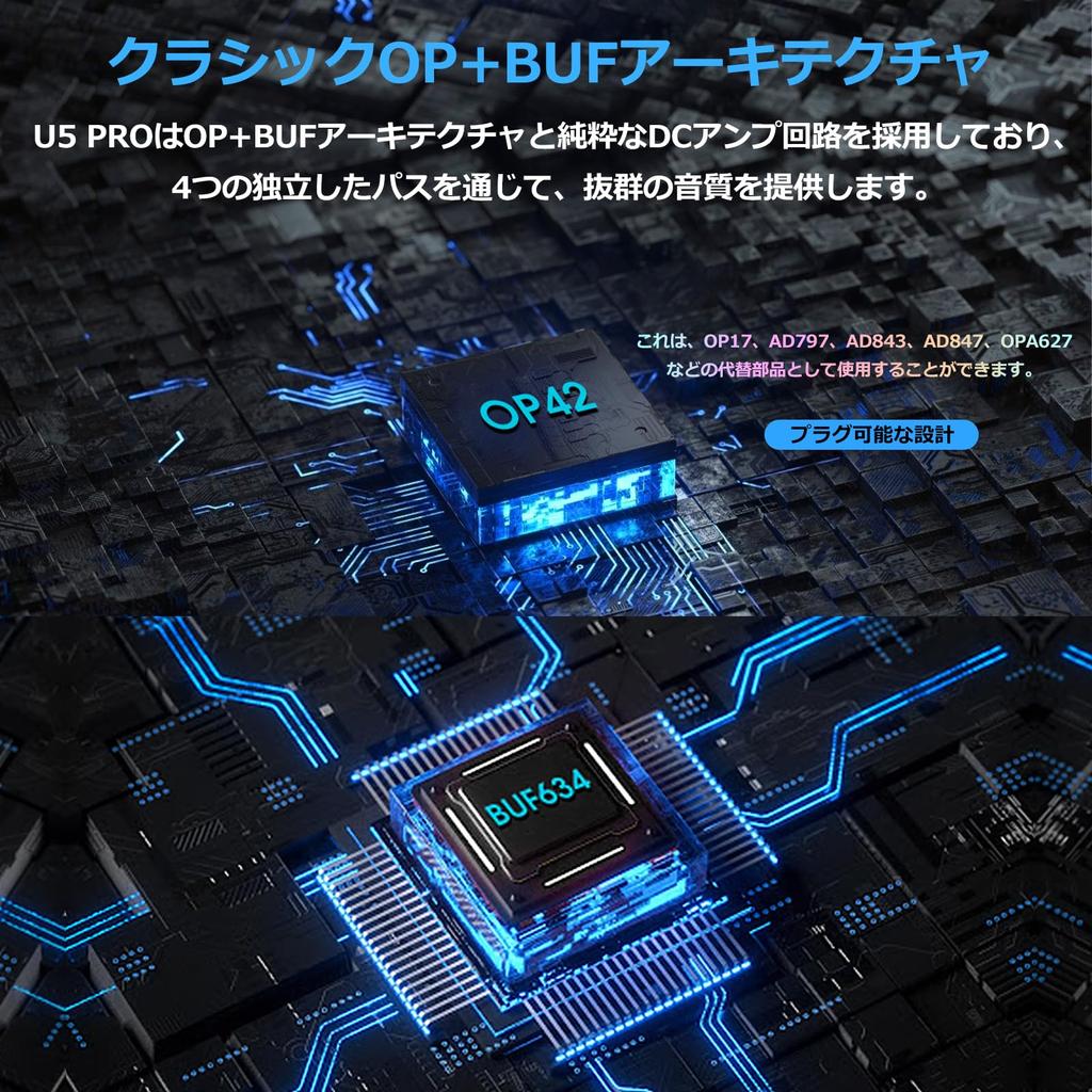 Классическая архитектура OP+BUF: Благодаря OP42 и BUF634, U5 PRO имеет классическую архитектуру OP+BUF и чистую схему усилителя постоянного тока для воспроизведения каждой ноты с превосходной ясностью и чистотой.. Разработанный с 4 независимыми каналами, он обеспечивает идеальное качество звука для любителей музыки.