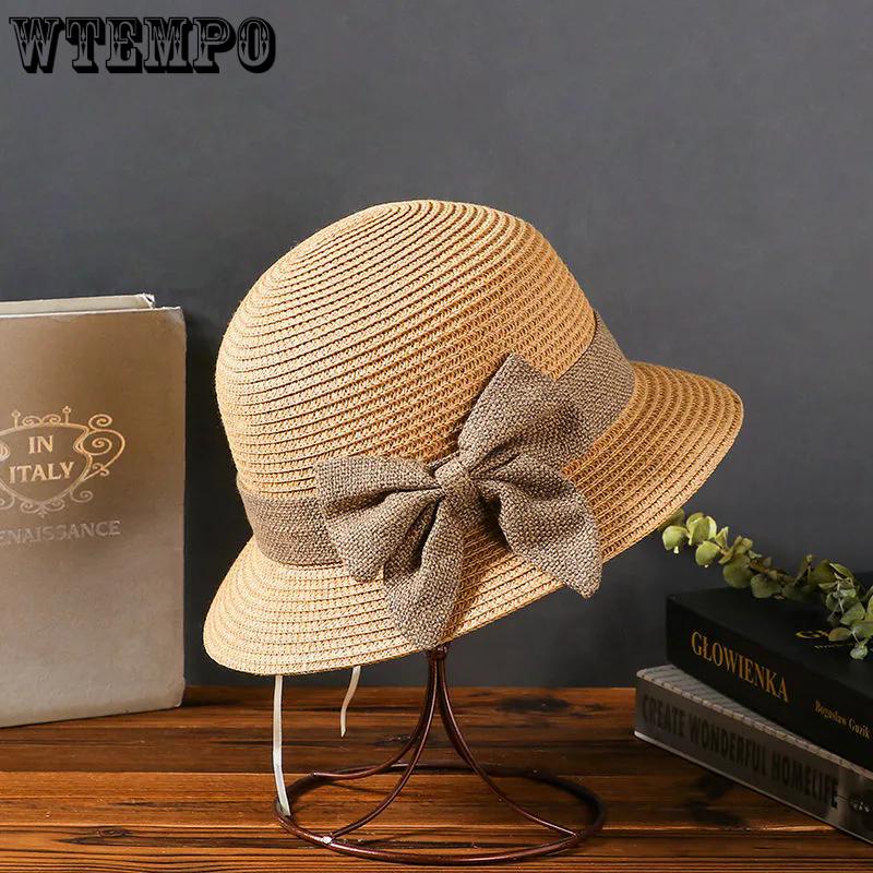WTEMPO Элегантные повседневные складные летние соломенные шляпы с бантом и широкими полями для женщин, однотонные солнцезащитные шляпы для отдыха на природе