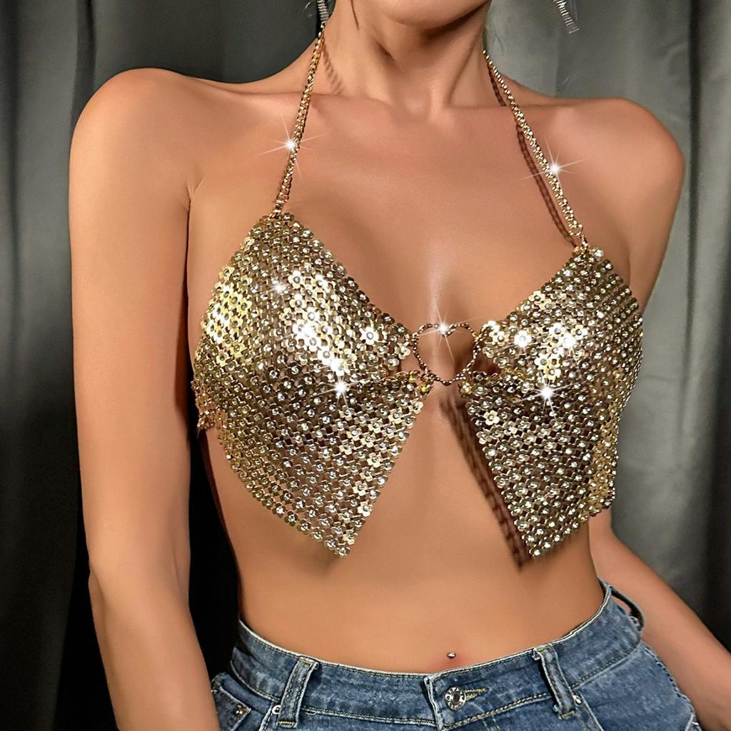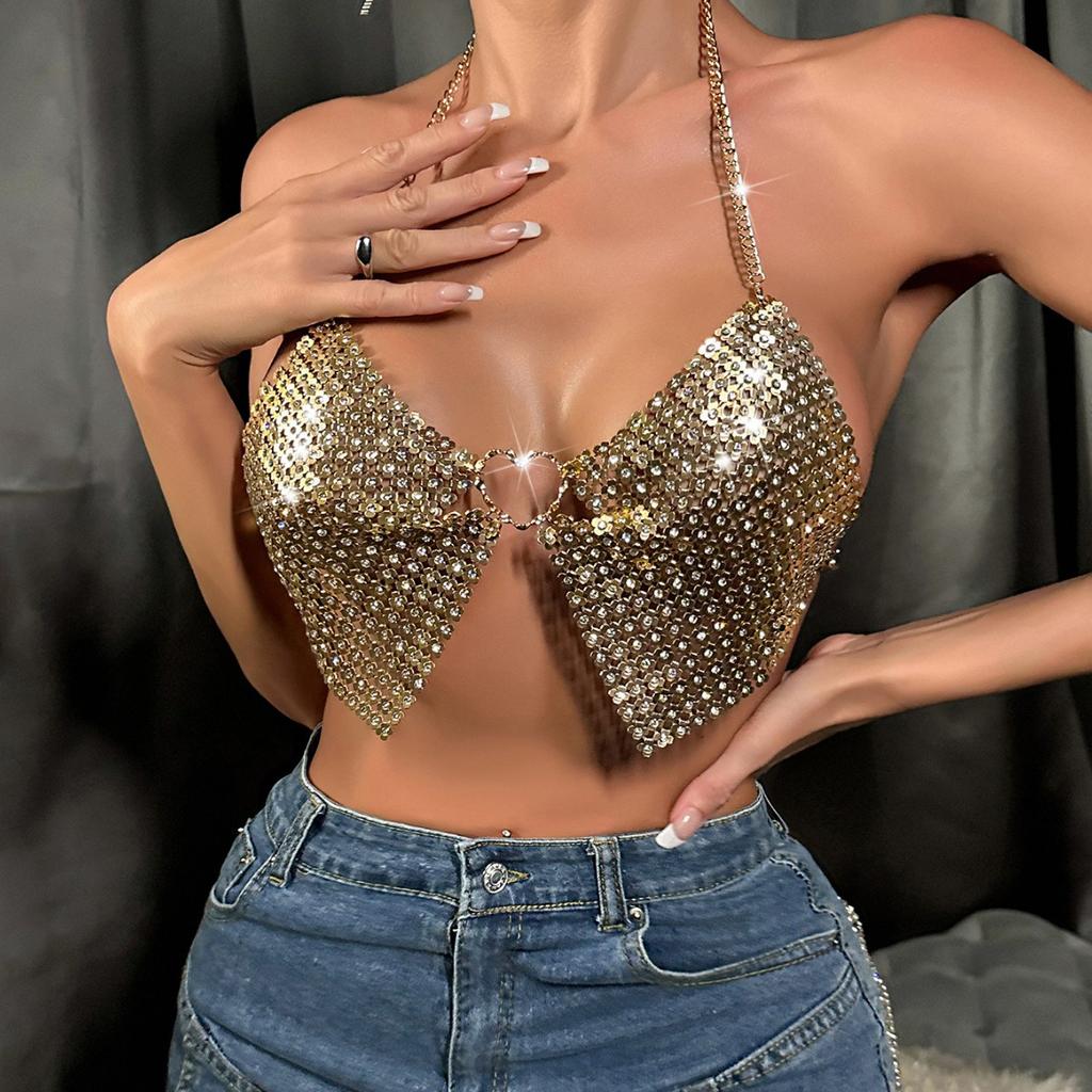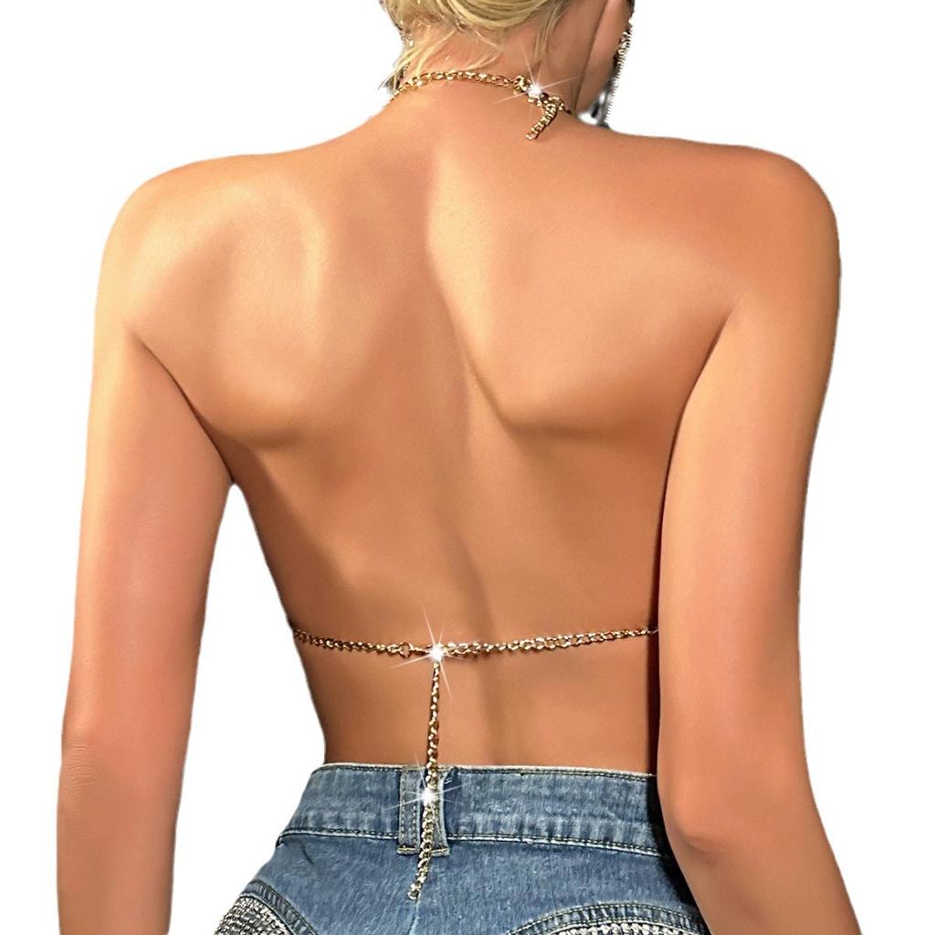 Мода 2025 года, новые металлические стразы ручной работы для ночного клуба, сексуальный топ с открытой спиной и открытым воротом для женщин