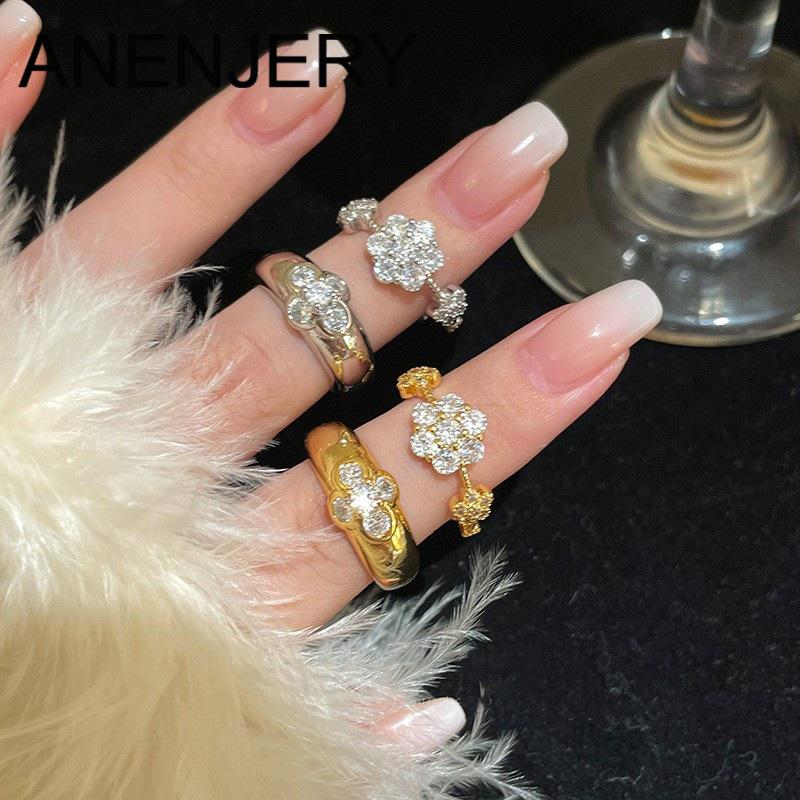 ANENJERY Серебристо-золотой Четырехлистный цветок циркон Открытое кольцо для женщин Роскошные вечерние винтажные ювелирные изделия оптом