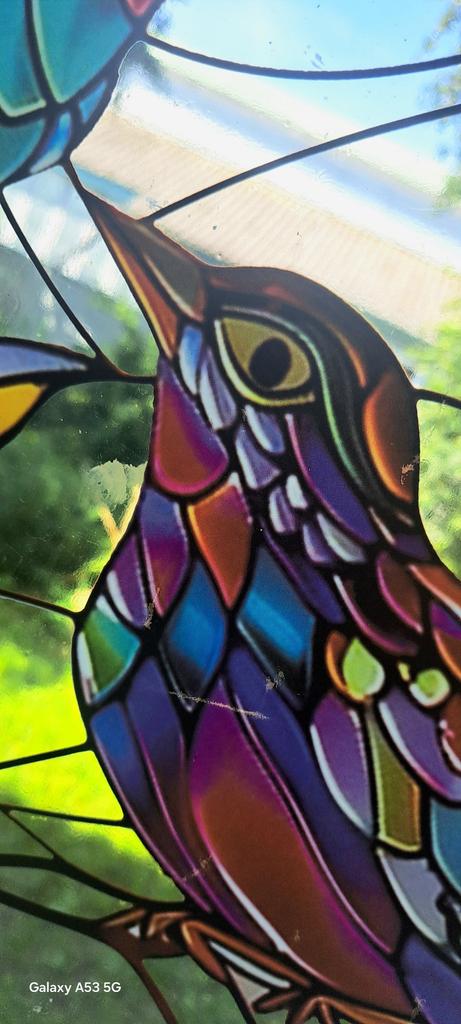 Картинка красивая, но сделана не как мозаика из разноцветных прозрачных пленок, как мне изначально казалось, а как непрозрачный рисунок на прозрачной бесцветной пленке. Без липкой основы, наклеивается на влажное стекло. Держится хорошо.