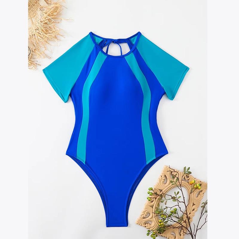 Лоскутный спортивный купальник женский вырезанный с открытой спиной цельный купальник женский короткий рукав купальный костюм пляжная одежда монокини