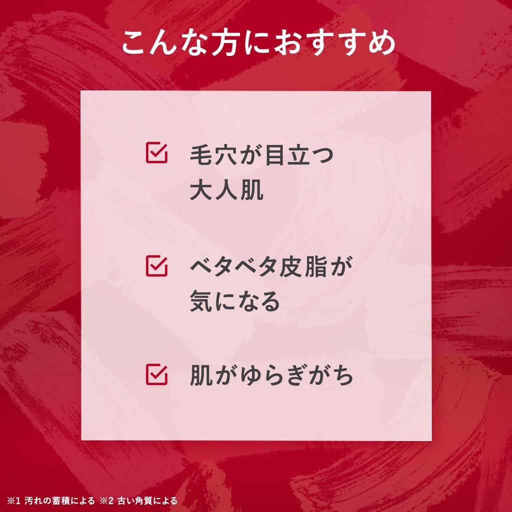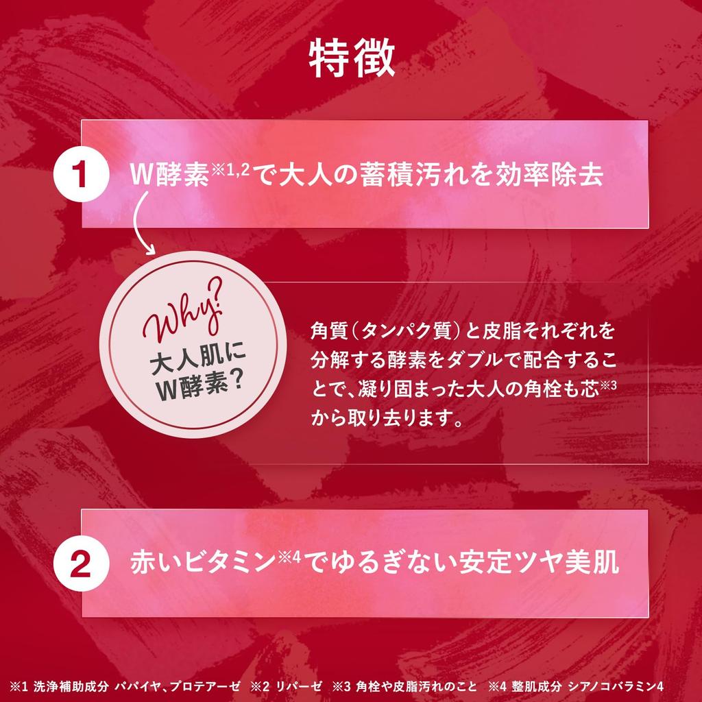 Ингредиенты моющих средств Папаин, протеаза *7 Липаза *Ингредиенты моющих средств 2. Четыре основных ингредиента, красный витамин *8, дарят вам непоколебимую, стабильную и красивую кожу. Красный витамин *8, который является ингредиентом для предотвращения огрубения кожи, дополнен антивозрастными ингредиентами *9 для поддержки непоколебимой, здоровой кожи.. ・Витамин B12 *10 Известный как «красный витамин», его яркий красный цвет предотвращает шероховатость кожи и придает ей яркий, сияющий цвет.. ・Производное витамина С *11 Ухаживает за порами, подтягивает кожу и улучшает ее текстуру *12 ингредиентов ・Гидролизованный коллаген *13 Придает упругость, эластичность и упругость взрослой коже, которая имеет тенденцию к сморщиванию. ・Гуманизированный церамид *14 Увлажняющий ингредиент, который увлажняет кожу взрослых, которая имеет тенденцию ощущаться стянутой после умывания *8 Ингредиент для ухода за кожей цианокобаламин, *9 Уход, соответствующий возрасту *10 Ингредиент для ухода за кожей цианокобаламин *11 Ингредиент для ухода за кожей аскорбил тетрагексилдеканоат *12 Разглаживает и кондиционирует поверхность кожи, делая поры менее заметными *13 Ингредиент для ухода за кожей *14 Увлажняющий ингредиент Церамид NP Церамид NG Церамид AP 3. Уникально разработанный, простой в использовании и гигиеничный контейнер, который легко открывается одним нажатием, а лопаточка позволяет аккуратно зачерпнуть содержимое до самого конца.