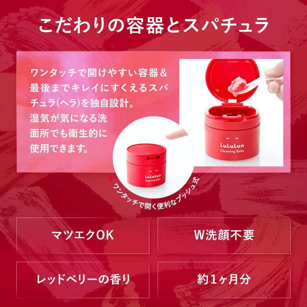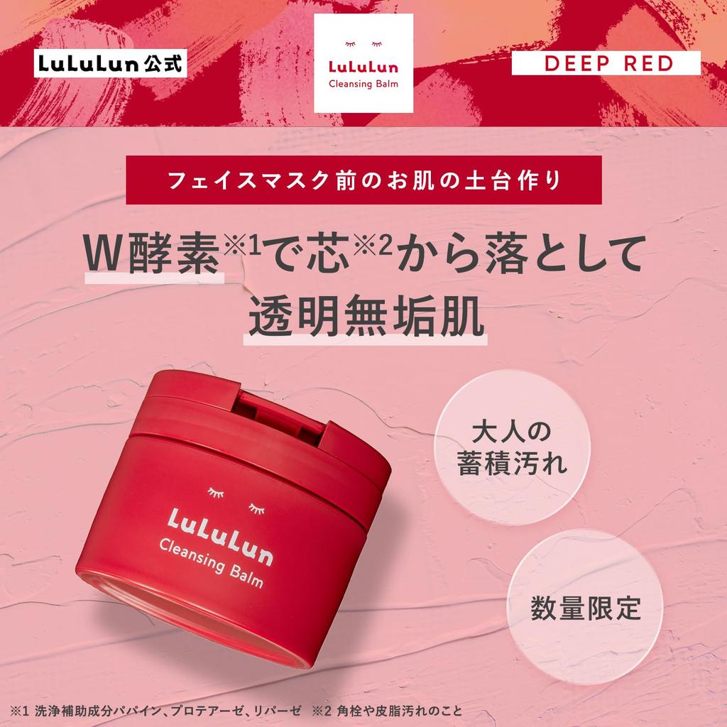 Цель Lululun — кожа, которой помогает уход.. Очищающий бальзам Lululun удаляет макияж и оставляет ощущение чистоты.. Средство для снятия макияжа, которое очищает поры, устраняет черные точки*1, устраняет тусклость*2 и жесткость кожи*3, а также устраняет заметные поры и липкий кожный жир на коже взрослых.. *1 Из-за омертвевших клеток кожи *2 Из-за скопления грязи *3 Из-за старых омертвевших клеток кожи. Он также очищает поры и удаляет омертвевшие клетки.. Очищающий бальзам Luluru DEEP RED удаляет ороговевшие клетки кожи с заметными порами, липким кожным салом и шелушащейся кожей с самого основания*5 с помощью двойного фермента*4, оставляя вам чистую, безупречную кожу.. *4 Вспомогательные чистящие ингредиенты: папаин, протеаза, липаза *5 Для квадратных пробок и пятен кожного сала Особенности: 1. Эффективно удаляет накопившуюся грязь у взрослых с помощью ферментов W *6 и 7. Ферменты, расщепляющие белки *6, и ферменты, расщепляющие кожное сало *7, удаляют стойкую накопившуюся грязь.. ・Протеолитический фермент папаин* Протеаза* Папаин и протеаза — ферменты, которые расщепляют белки, смягчают и разрыхляют затвердевшие омертвевшие клетки кожи, облегчая их удаление. ・Фермент, разрушающий кожный жир ``Липаза* Липаза, фермент, расщепляющий затвердевший кожный жир, мягко расщепляет скопившуюся грязь и быстро удаляет ее. * 6