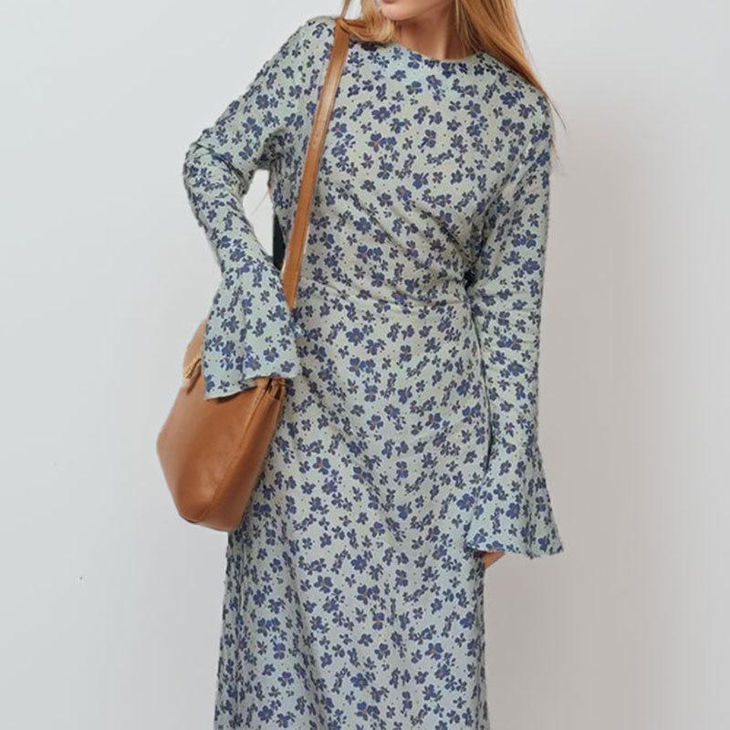 2025 весна новая женская одежда мода темперамент цветочный рог рукав круглый вырез длинное платье свободное повседневное платье