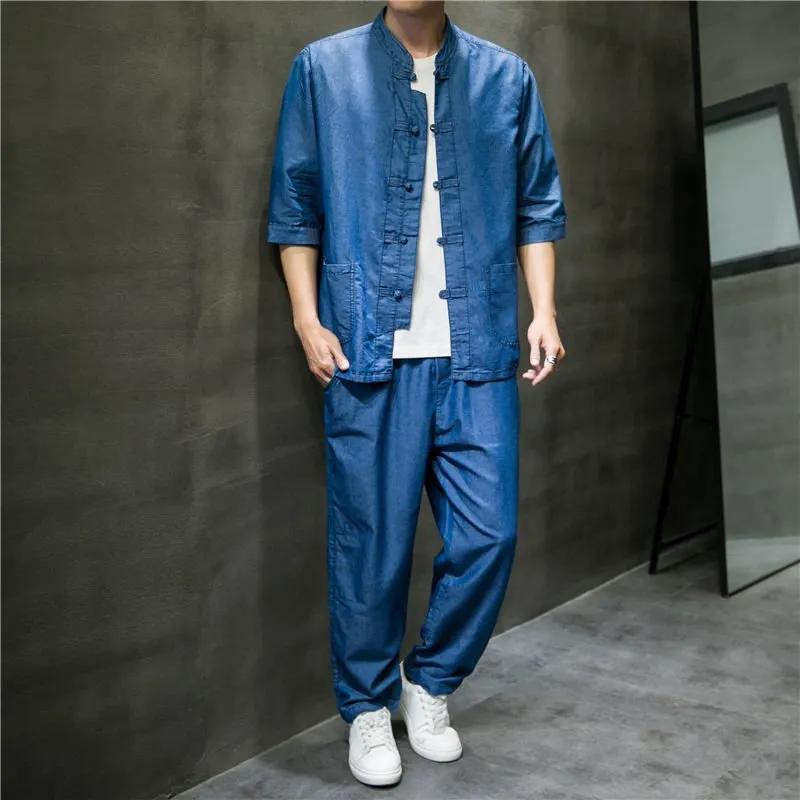 Летний мужской джинсовый костюм с воротником-стойкой, тонкая джинсовая рубашка со средней длиной рукава и пряжкой-диском в китайском стиле, верхние брюки
