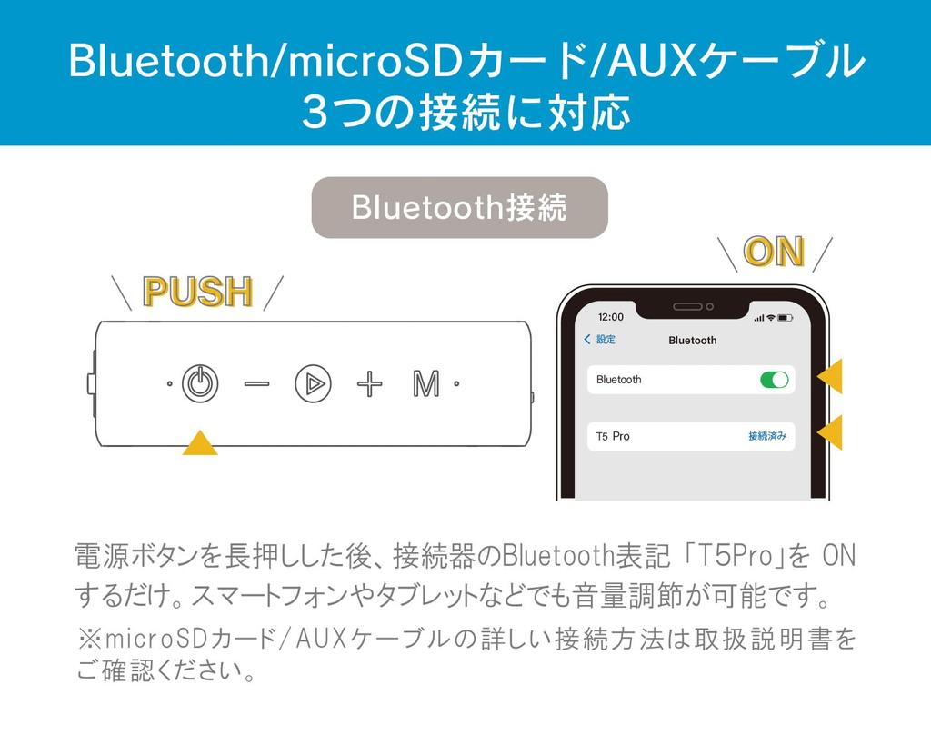 ✅ Оснащен Bluetooth 5.0: Легко подключается к смартфонам iPhone и Android, iPad и другим устройствам Bluetooth. Он также поддерживает TF (Микро SD) карты и терминалы AUX, позволяющие подключать такие устройства, как телевизоры и проекторы. *О картах microSD Поддерживаемая емкость: До 64 ГБ, Поддерживаемые форматы: FAT32, FAT, exFAT, Поддерживаемые расширения: mp3/wav/flac/wma *При использовании проверьте стандарт Bluetooth используемого носителя.. Невозможно установить соединение с несовместимыми устройствами.