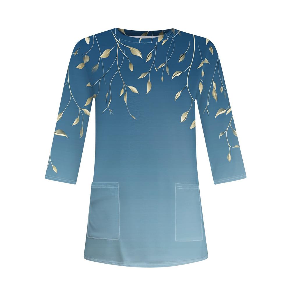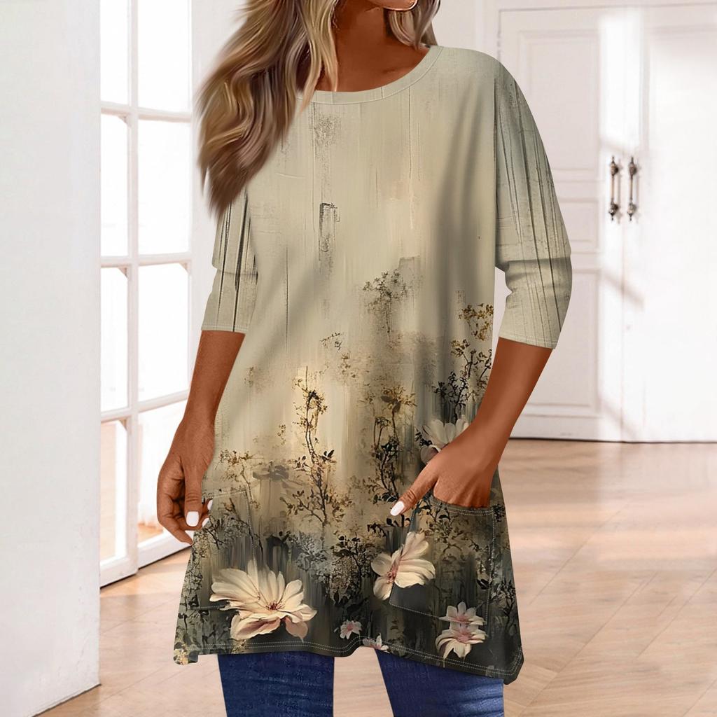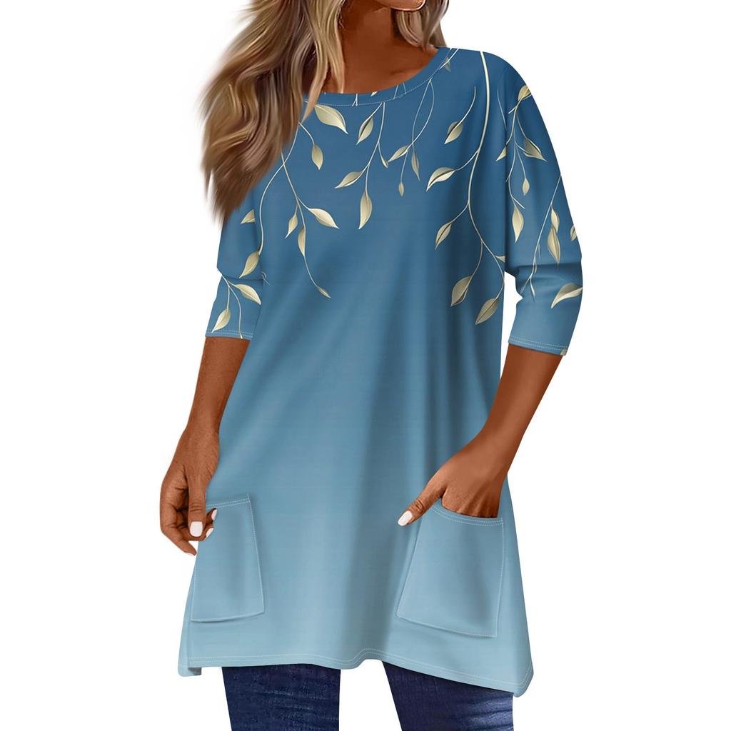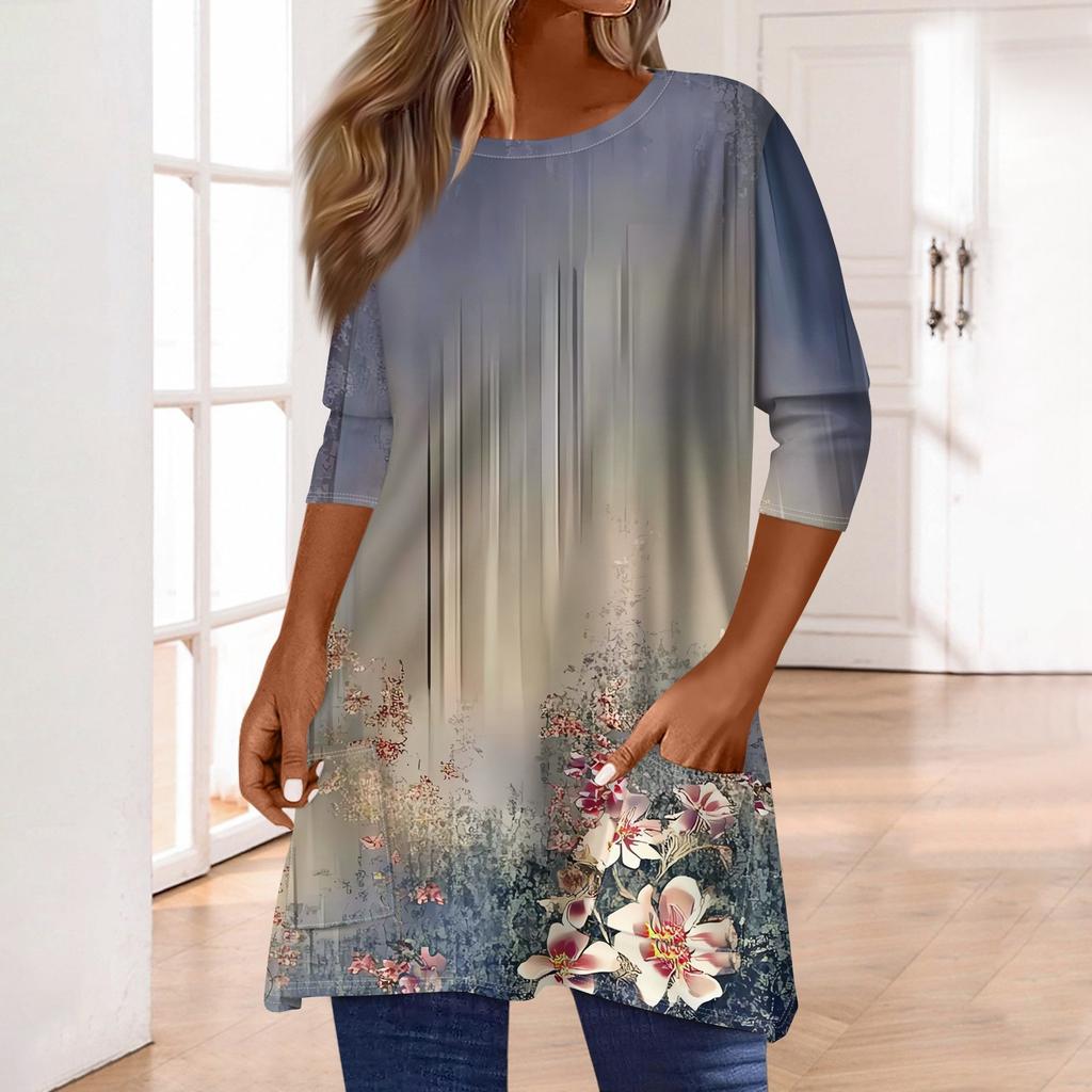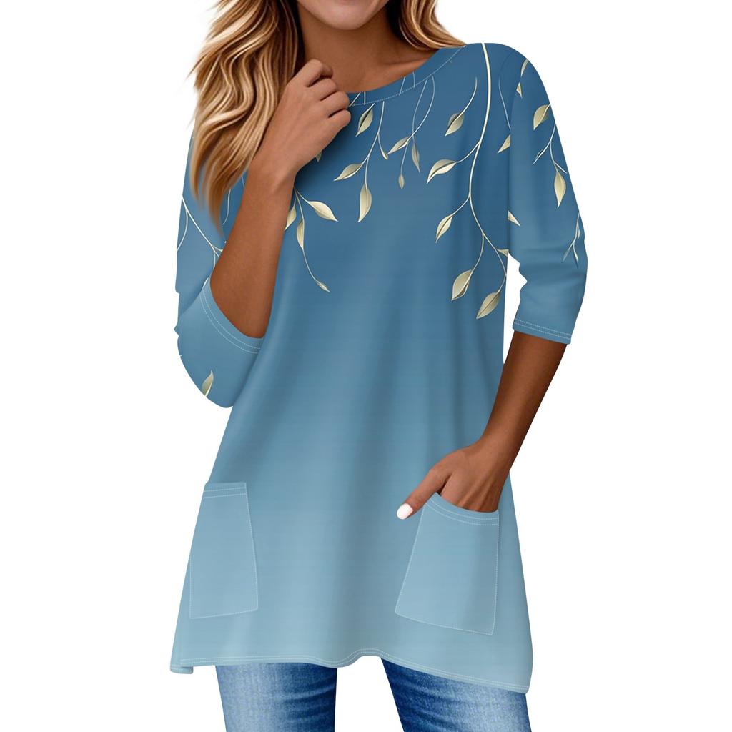3/4 рукава кармана топы для женщин футболка повседневный принт средней длины топы футболка круглый вырез пуловер блузка