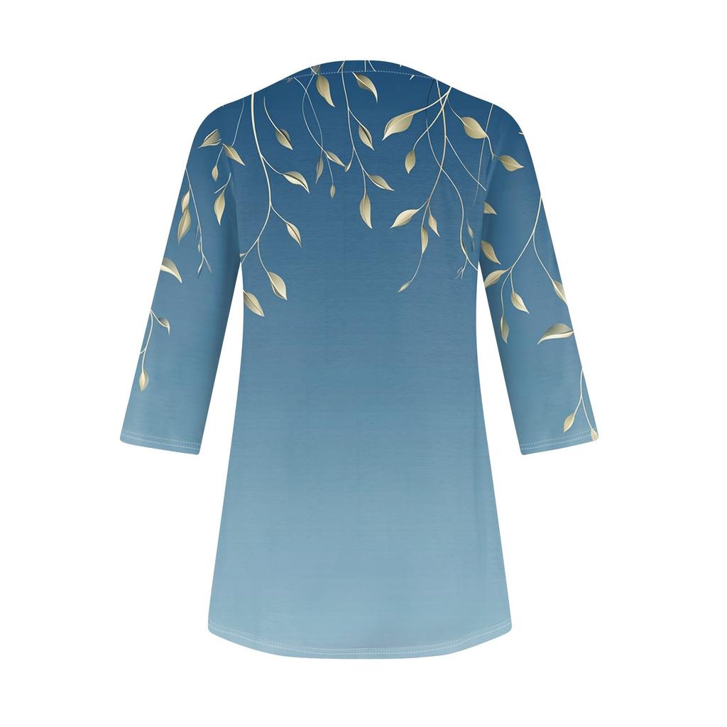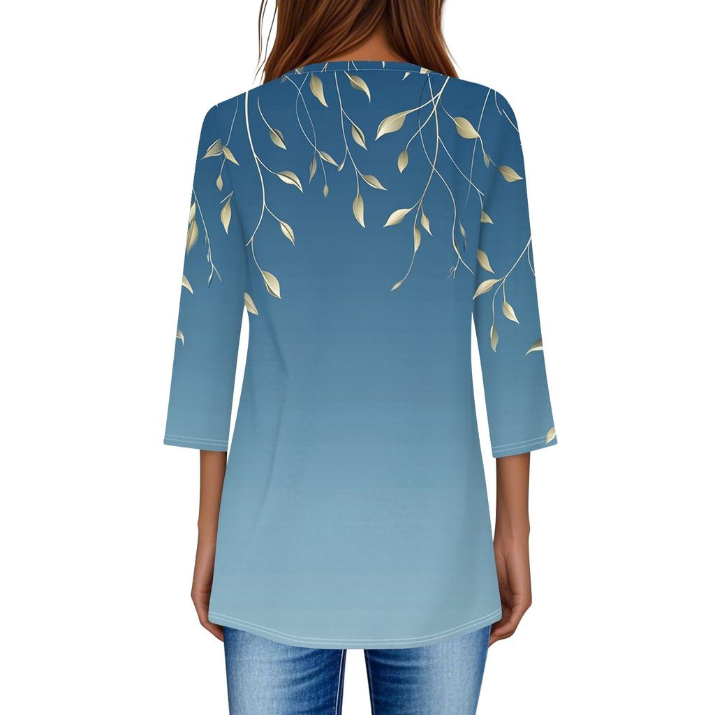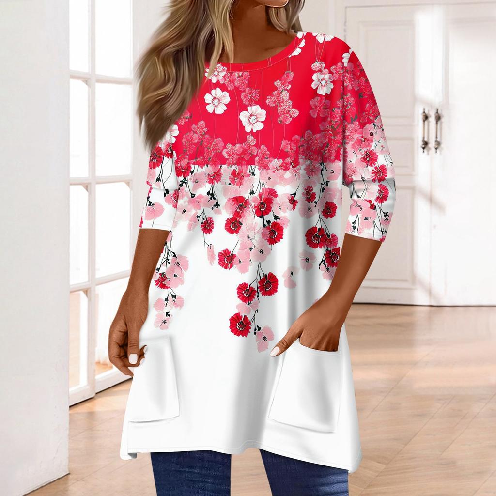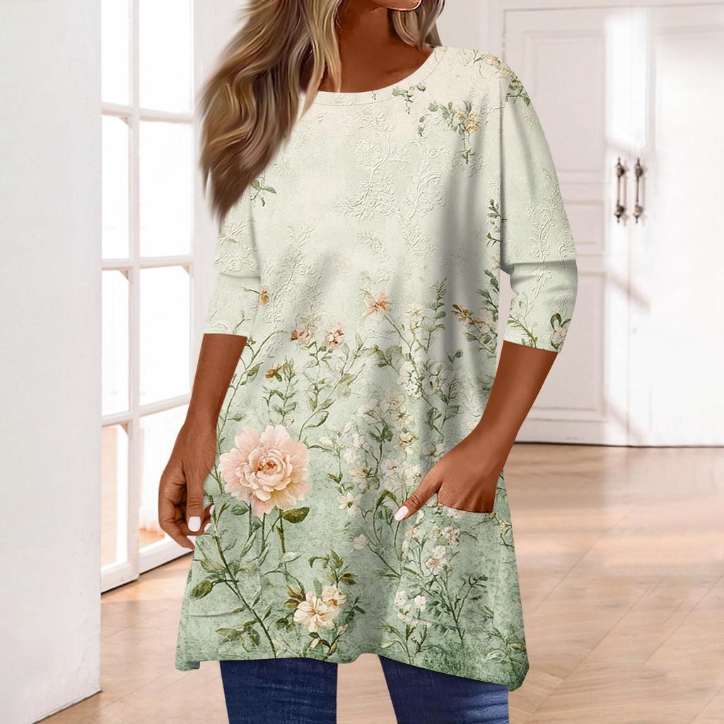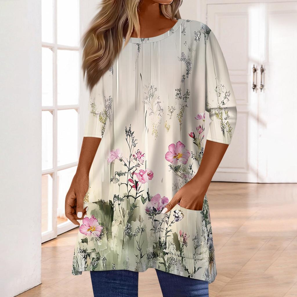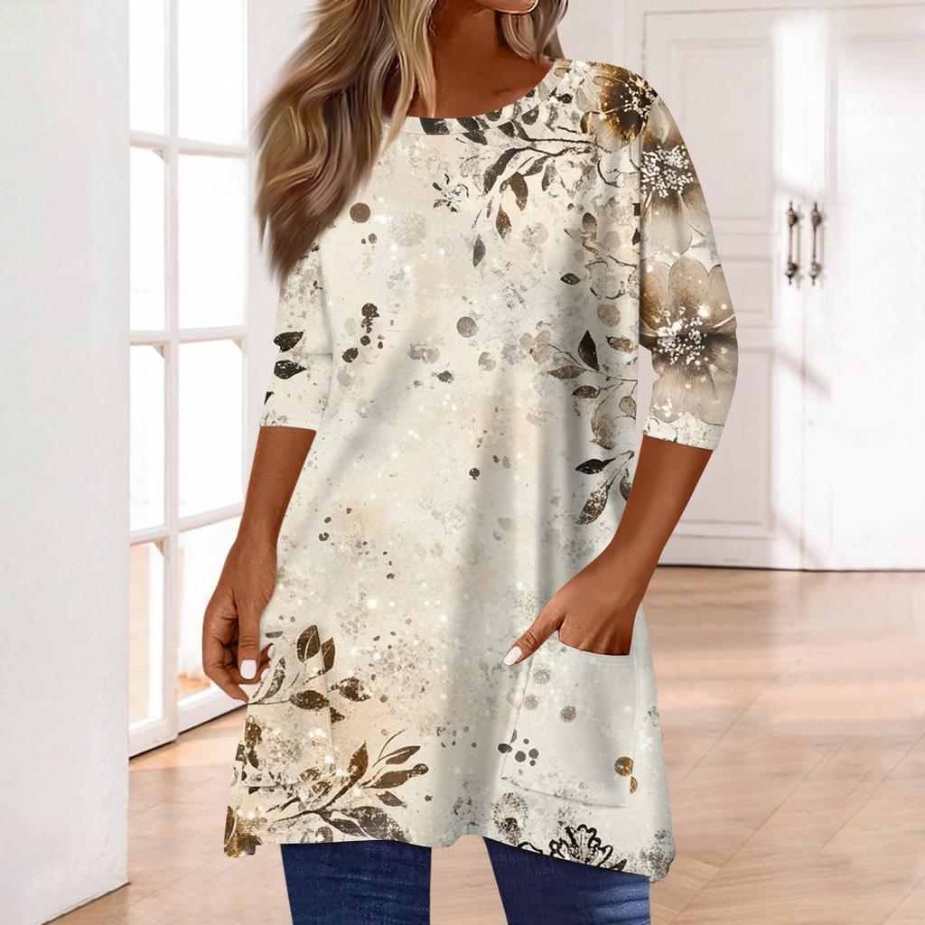3/4 рукава кармана топы для женщин футболка повседневный принт средней длины топы футболка круглый вырез пуловер блузка