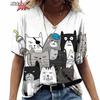 Футболка женская с принтом аниме-кота 2024 года, модная одежда в стиле Харадзюку, футболки большого размера с коротким рукавом и V-образным вырезом, женская повседневная уличная блузка