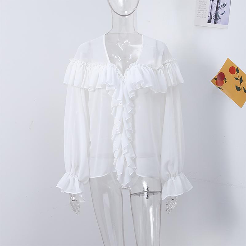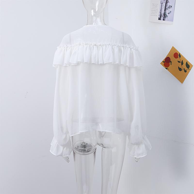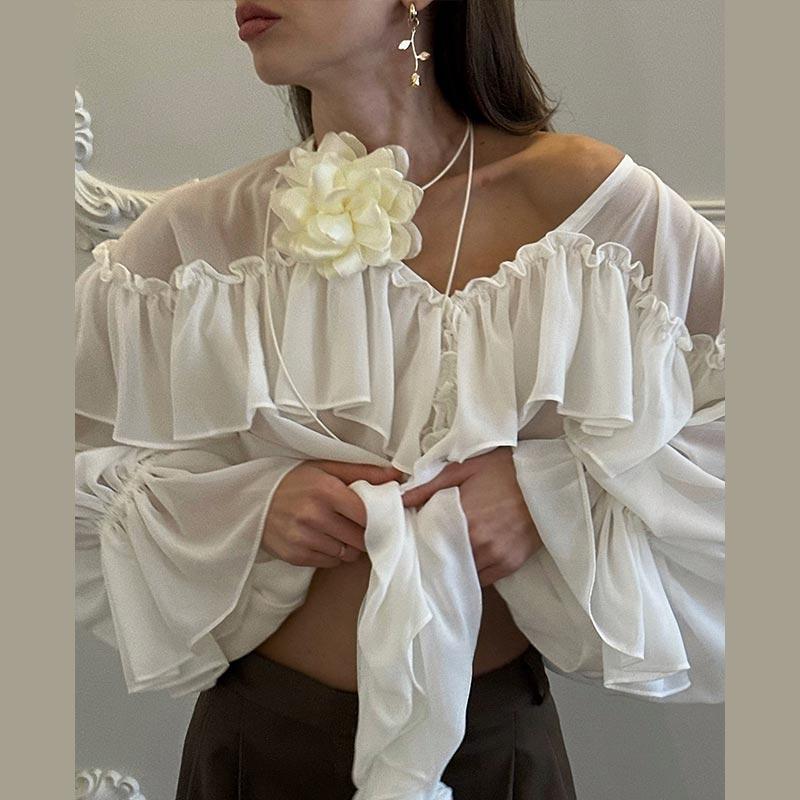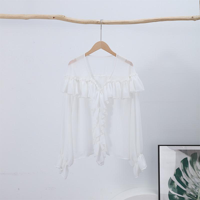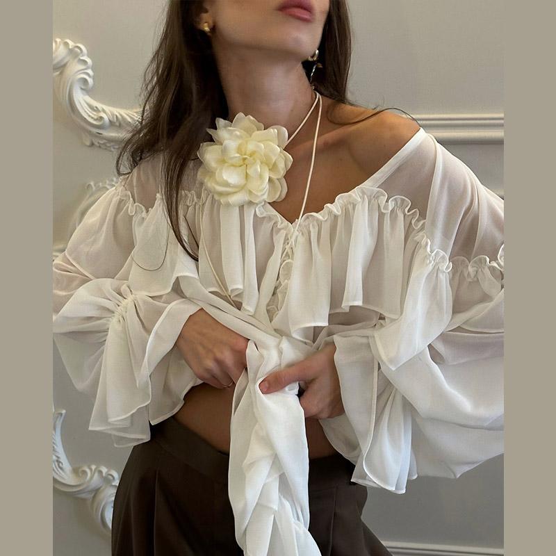 Женские шифоновые рубашки с оборками, белые свободные прозрачные блузки с V-образным вырезом и рукавами-фонариками, весна-лето 2025, женская верхняя одежда для поездок на работу