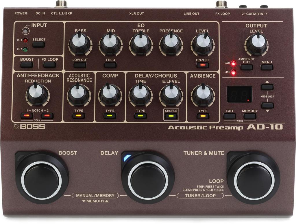 AD-10 — акустический предусилитель, предназначенный для гитаристов высокого класса, которые уделяют особое внимание звучанию своих электроакустических гитар во время живых выступлений.. AD-10 воспроизводит детали акустической гитары с высококачественным звуком, и вы можете создавать звук простым управлением с помощью ручек на панели.. Входная цепь имеет тщательно продуманную конструкцию с низким уровнем шума, которая может передавать высококачественные сигналы от встроенного предусилителя и пьезоэлектрического усилителя, а также имеются две входные системы, совместимые как с пьезоэлектрическими, так и с магнитными звукоснимателями.. Также он оснащен акустическим резонансом, воспроизводящим оригинальный «звон» акустической гитары, компрессором, использующим обработку MDP, и 4-полосным эквалайзером, оптимизированным для акустики, что позволяет создавать высококачественные звуки.. Мы также предоставляем подпараметры, которые позволяют вам точно создавать свой тон, а также специальные эффекты, такие как атмосфера.. Кроме того, в качестве меры противодействия обратной связи, он оснащен двумя системами вырезов и функцией снижения с небольшим изменением тона.. Два стереовыхода (XLR, стандартный) можно настраивать различными способами в зависимости от ситуации на живом выступлении.