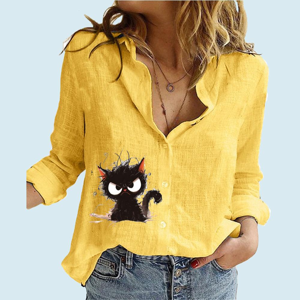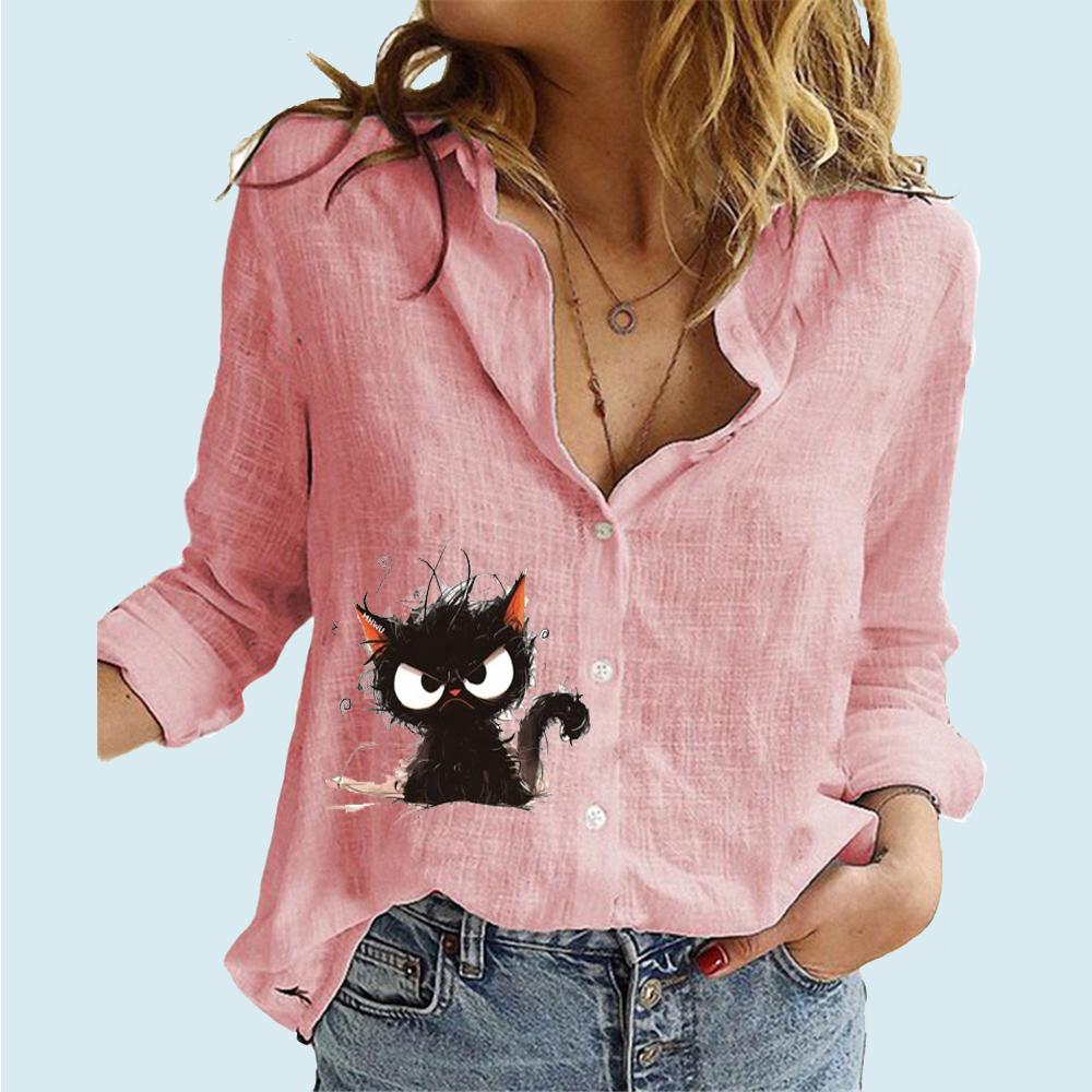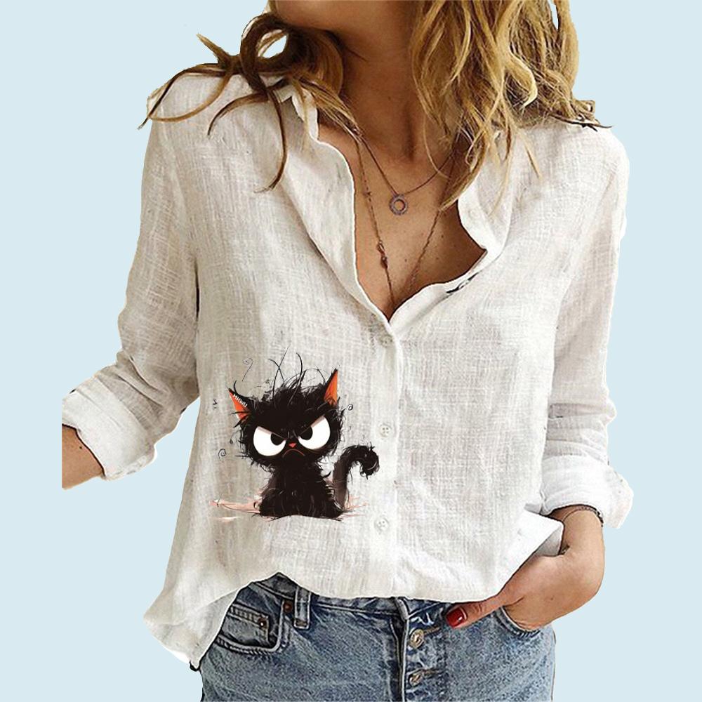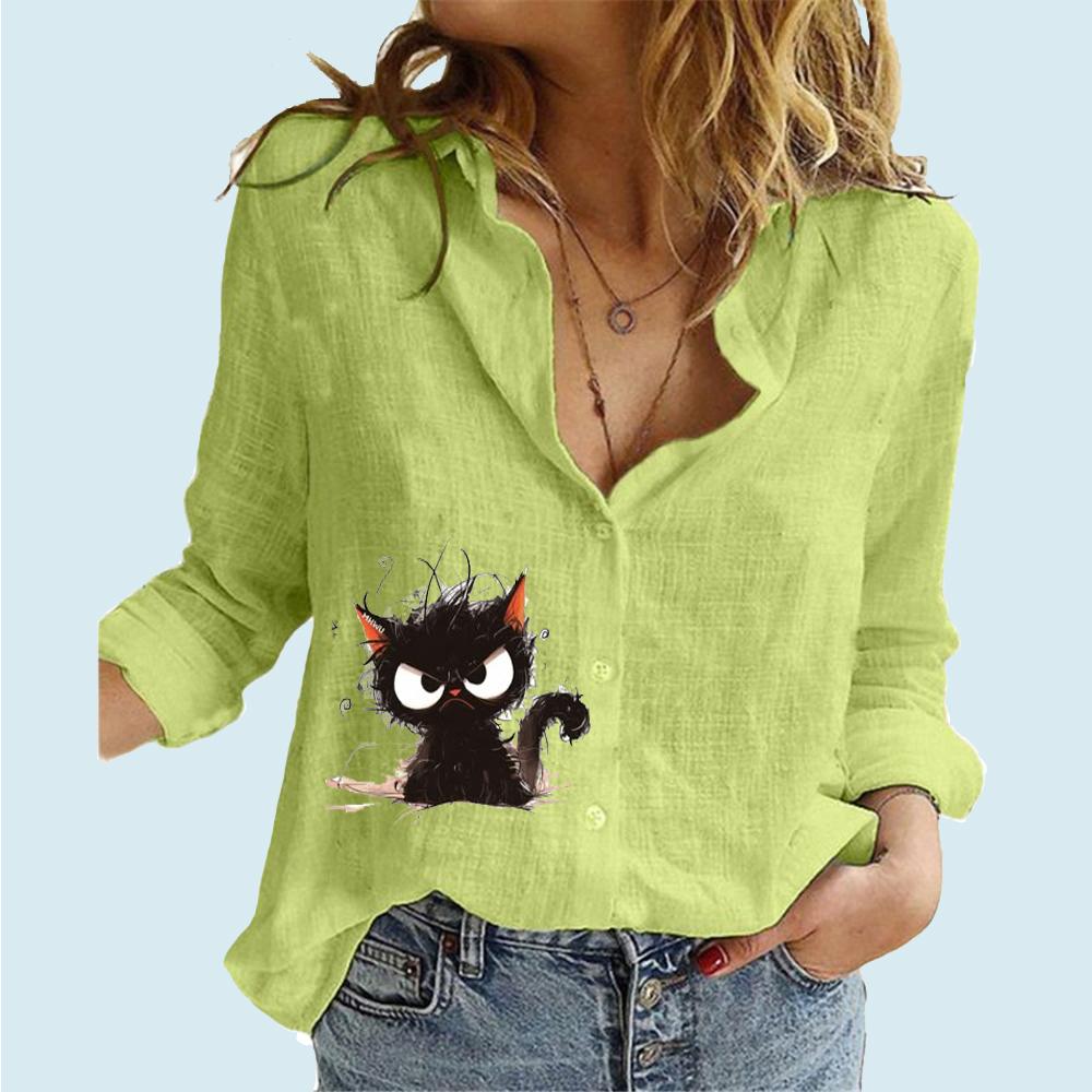 Женская модная рубашка с длинным рукавом на пуговицах, женская повседневная тонкая хлопковая льняная блузка с длинным рукавом и принтом кошки