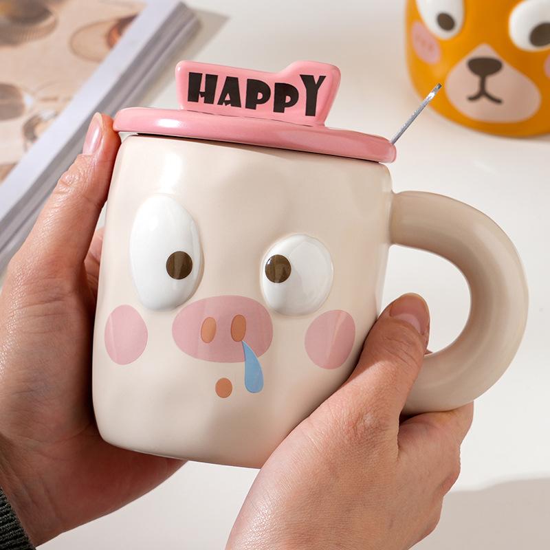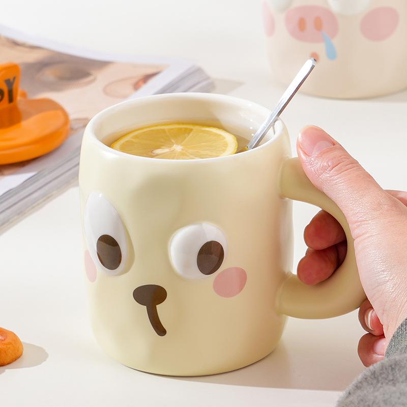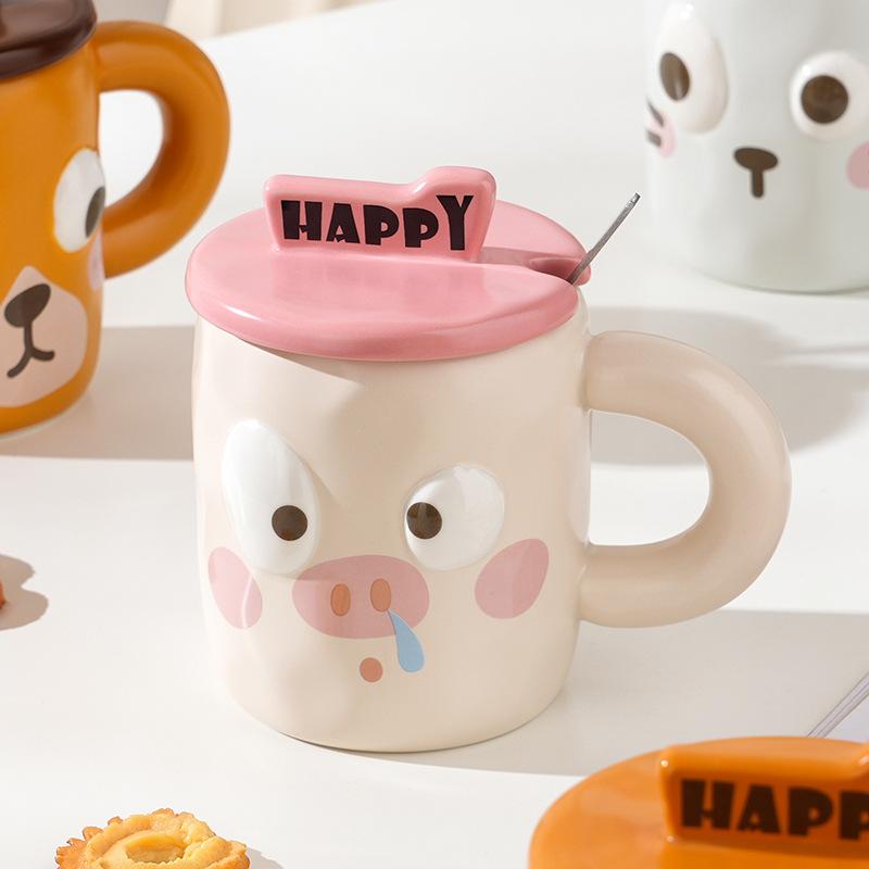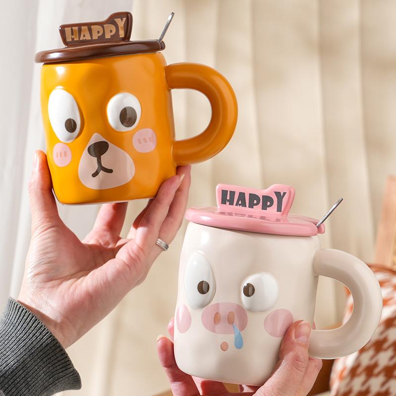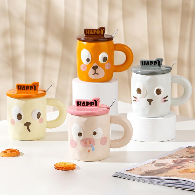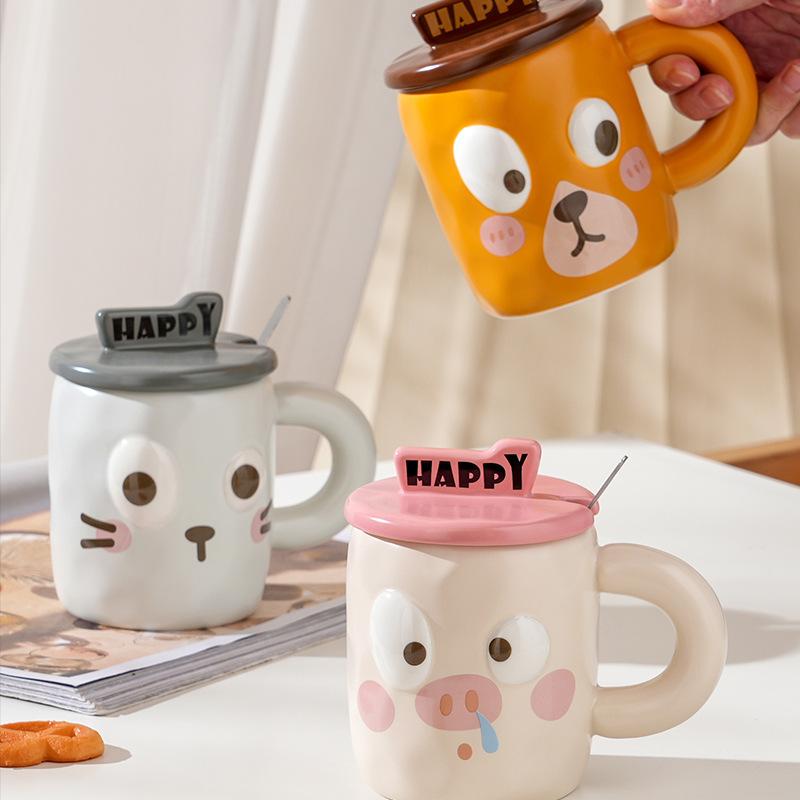 Простой набор для домашнего использования из керамических чашек с крышкой, ложкой и эффектным рисунком в виде мультяшного животного, кружка для завтрака в офисе, стакан для воды