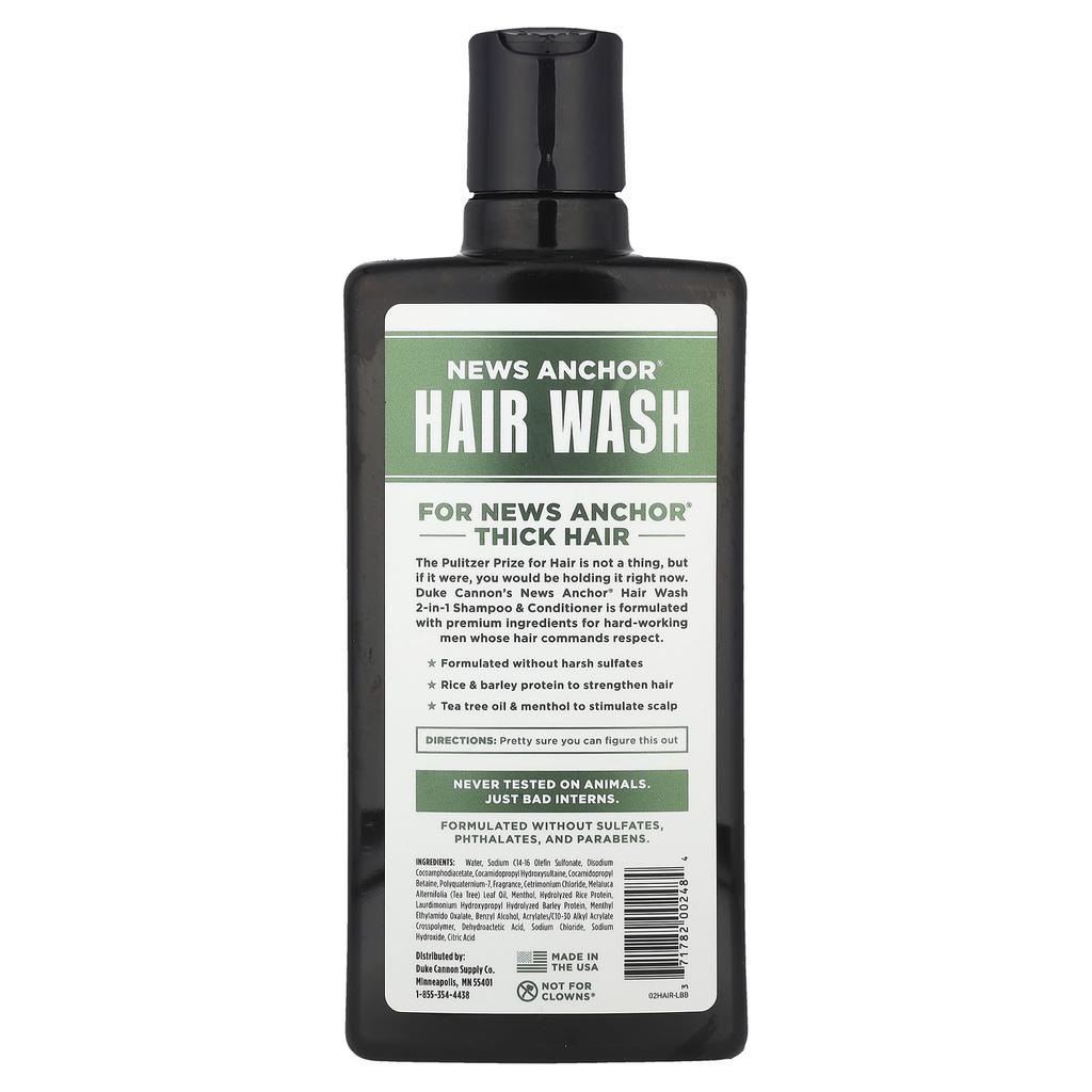 Описание товара: НЕ тестируется на животных. Изготовлено без сульфатов, фталатов и парабенов. Не для Clides®. News Anchor®. Для густых волос. Он не получил премию Pellicher Award за волосы, но если бы получил, я бы купил его прямо сейчас.. Шампунь и кондиционер News Anchor® Hair Wash 2-in-1 от Duke Cannon создан на основе высококачественных ингредиентов для мужских волос, подверженных интенсивному воздействию.. Не содержит вредных сульфатов. Протеины риса и ячменя укрепляют волосы. Масло чайного дерева и ментол стимулируют кожу головы.