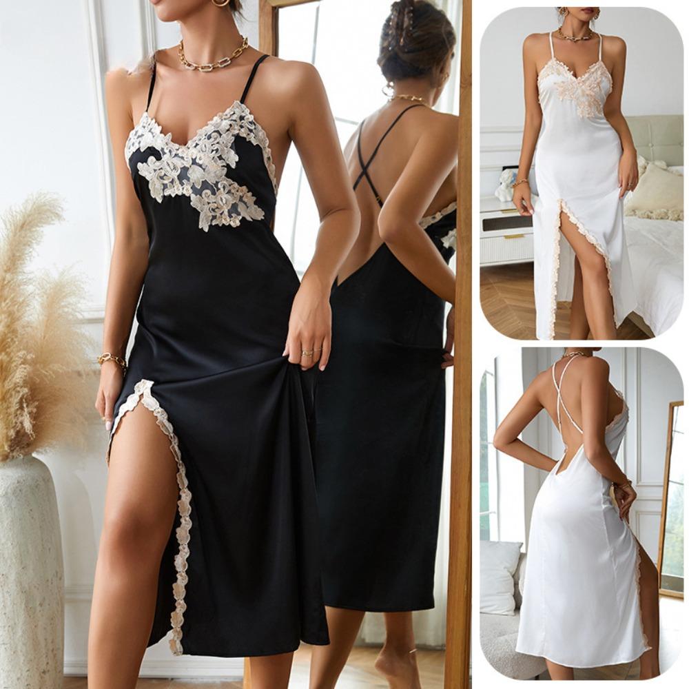 Пижама из искусственного шелка с кружевом, сексуальная, с V-образным вырезом, с длинными разрезами, на подтяжках, домашняя одежда