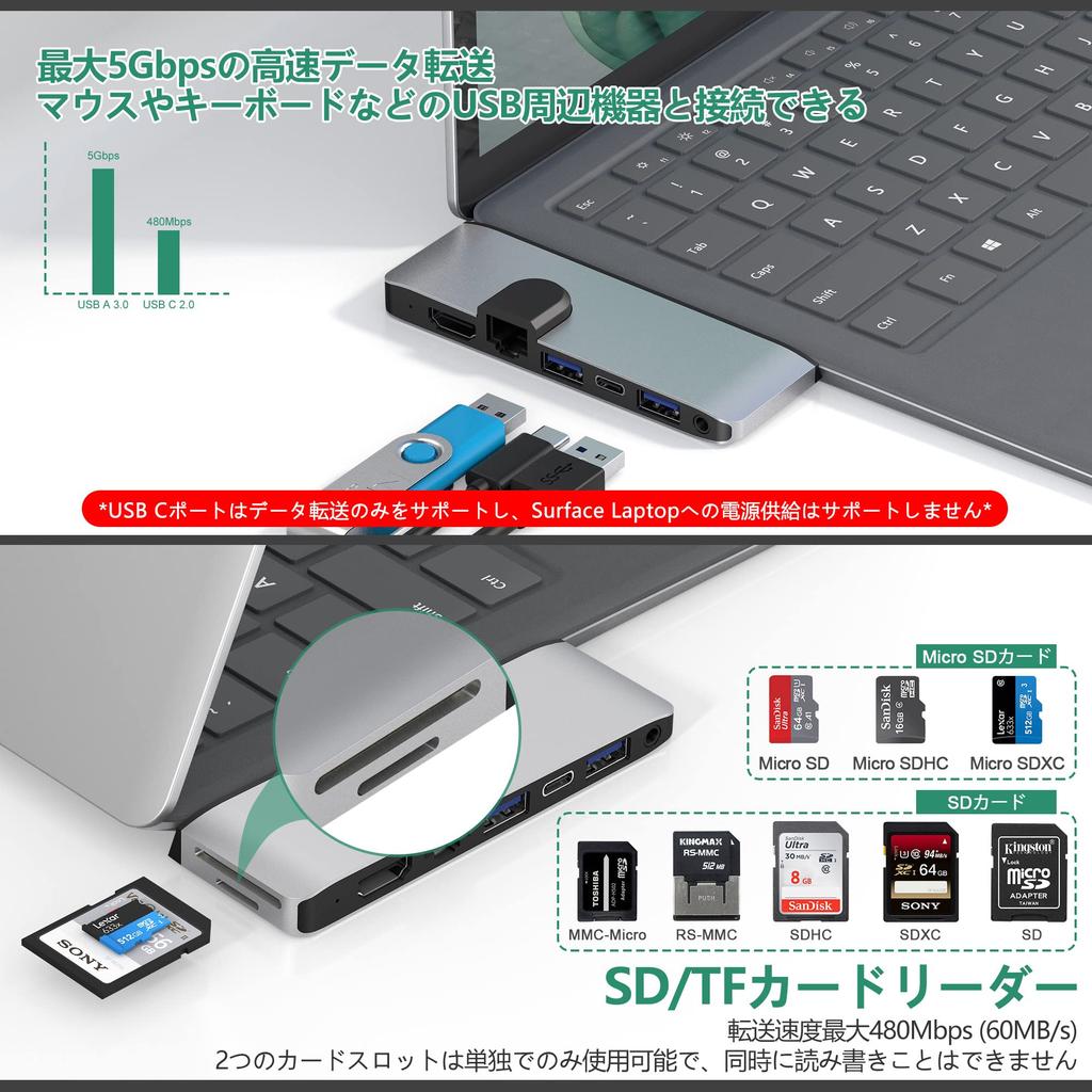 [USB-концентратор 8-в-3, совместимый с новейшим ноутбуком Surface 5] Беспроводная конструкция на основе портов USB A+USB C+3,5 мм ноутбука Microsoft Surface 5/4/3/Go 2/Go, расширенная до порта HDMI, 2 портов USB 3.0, порта USB C 2.0, сетевого порта LAN, устройства чтения карт SD+TF и аудиопорта 3,5 мм. Подключай и работай, драйверы не требуются, простота использования и отсутствие загромождения рабочего стола.. (Примечание 1: При использовании устройства Surface не прикрепляйте к порту защитный чехол или что-либо еще, что может помешать соединению с ним.)