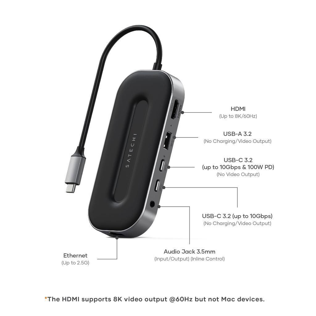 [Расширение портов 6-в-1] Порт HDMI (8К/60Гц) совместимый, порт данных USB-A (максимальная скорость 10 Гбит/с), Порт USB-C 3.2 PD (Сквозная зарядка 100 Вт и передача данных 10 Гбит/с *несовместимо с видеовыходом), Порт данных USB-C (максимум 10 Гбит/с), 3,5-мм аудиоразъем (микрофон и выход, (Поддерживает встроенную работу), Порт Этернет (Совместимость с 2.5G) (При использовании кабеля локальной сети перед использованием удалите существующую USB-локальную сеть в системной среде Mac, создайте новую и перезагрузите компьютер.)