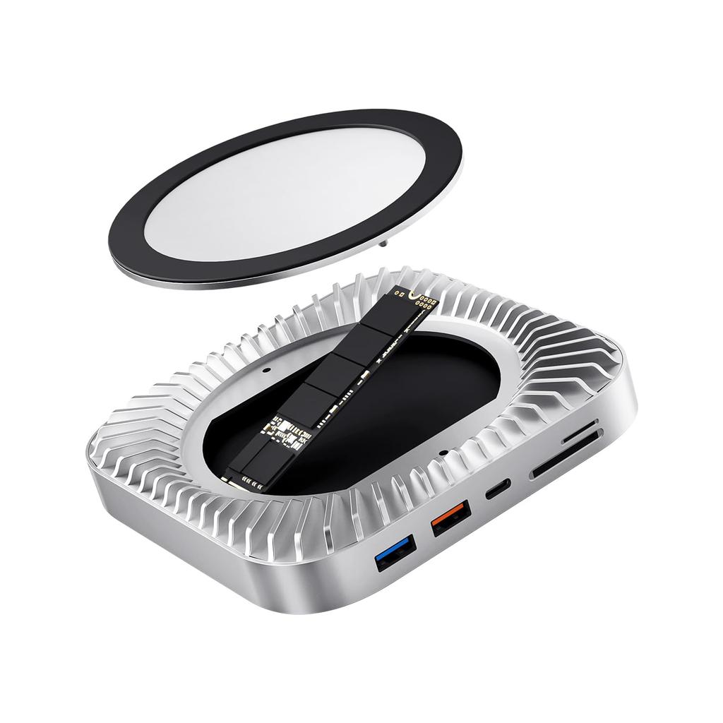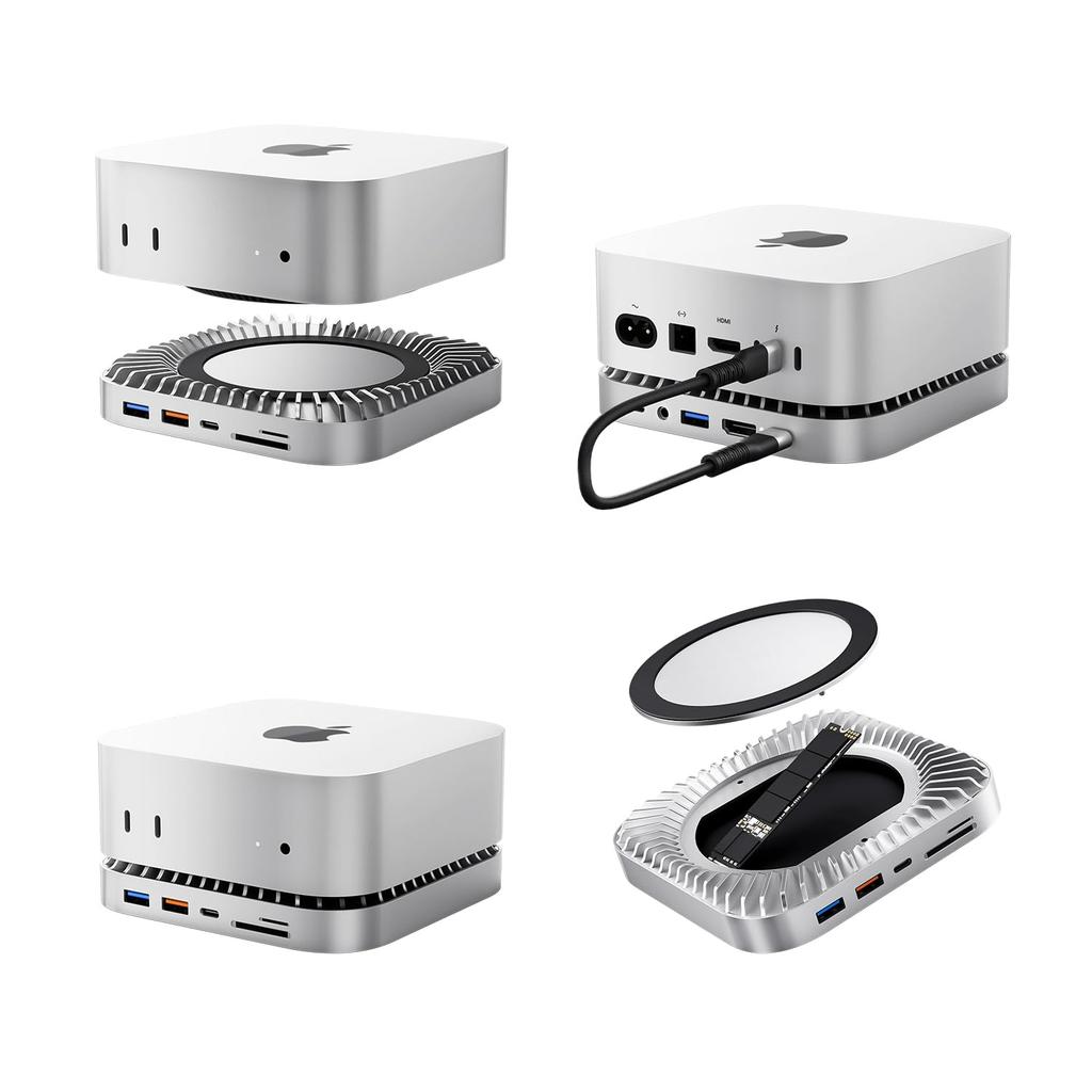 Первый в мире концентратор, разработанный специально для Mac Mini 2024 года. Подставка и концентратор Mac Mini с корпусом NVMe — это первый в мире концентратор, разработанный специально для Mac Mini 2024 года.. Изготовленный из высококачественного алюминиевого сплава, он не только дополняет элегантный дизайн Mac Mini, но и повышает долговечность и рассеивание тепла.. Предлагая непревзойденные возможности подключения, расширения памяти и тепловые характеристики, он обеспечивает превосходную производительность, сохраняя при этом современный минималистский внешний вид.