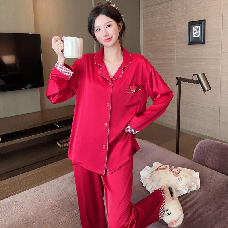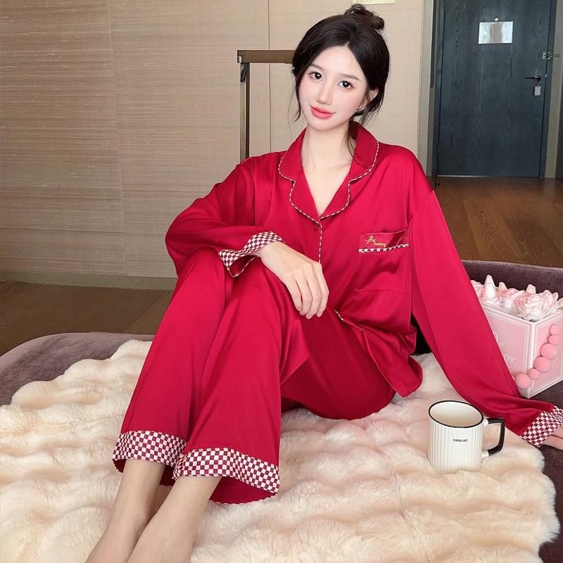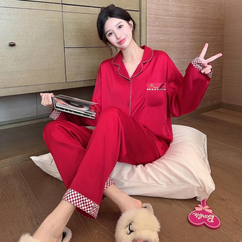 Весенне-осенняя женская пижама с длинными рукавами из ледяного шелка, домашний комплект этого года, праздничная красная пижама, домашний костюм для отдыха