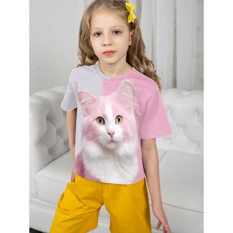 Одежда для девочек, розовая футболка с милым котенком и 3D-принтом, детский топ с круглым вырезом и короткими рукавами