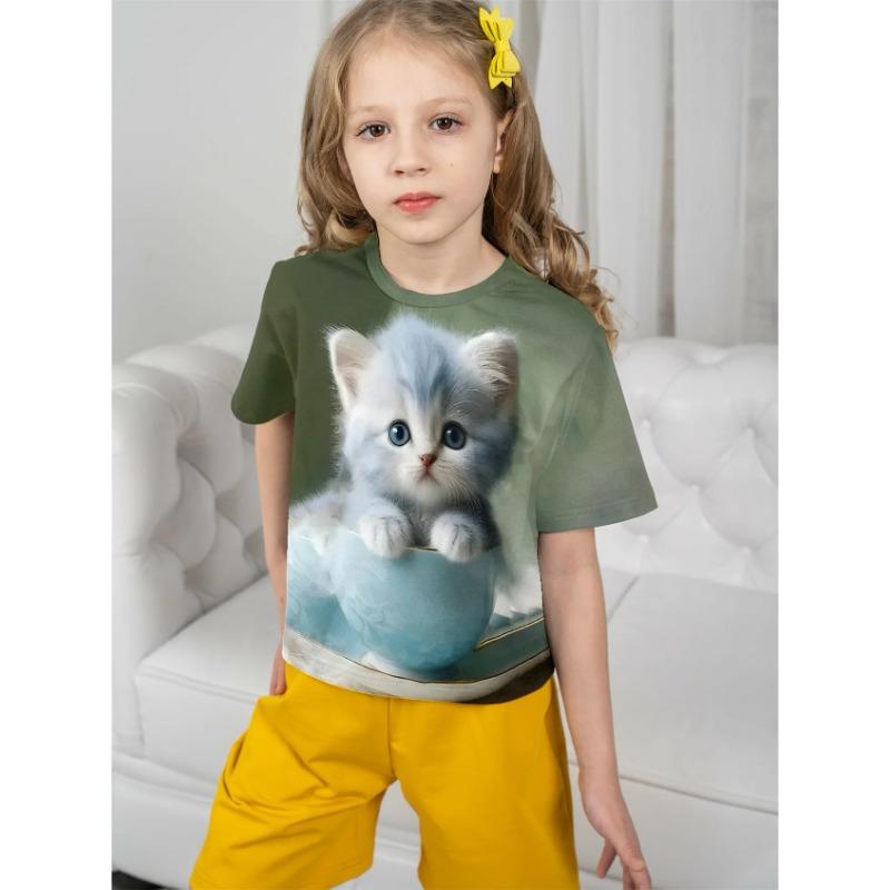 Новая футболка для девочек с принтом 3D котенка, круглый вырез, короткий рукав