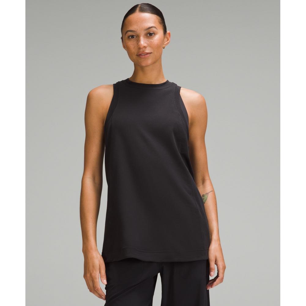 Coverage, just where you want it. This soft cotton tank features a high crew neckline, low armholes for airflow, and a long, bum-covering length.