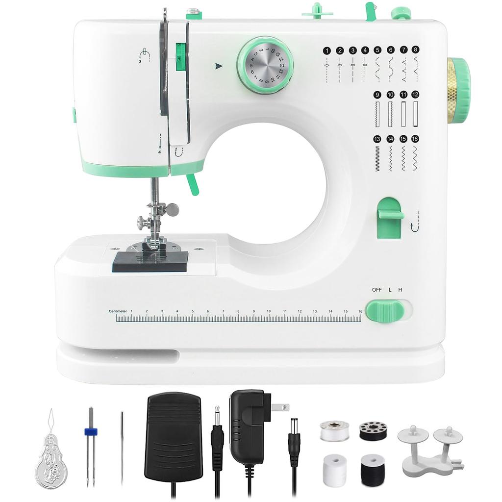 Новая мини-швейная машинка оснащена функцией двухигольной 2-скоростной 2-ниточной шитья, что облегчает шитье, а также имеет 16 стежков «задний шов», функцию пришивания пуговиц для манжет, намотки и т. д., что является хорошим помощником для самостоятельного шитья.