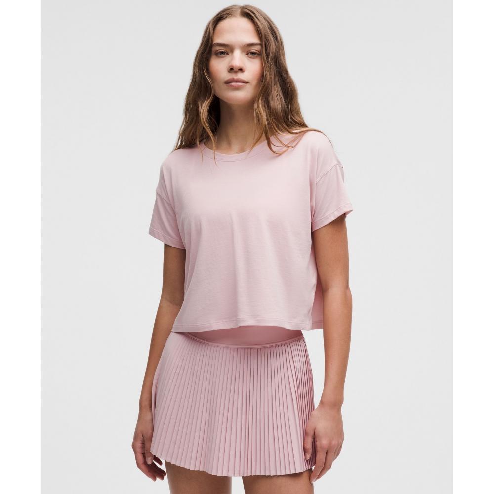 Feel that post-practice bliss all day long in this soft, lightweight tee. Super-soft Pima cotton fabric is soft and naturally breathable, with added Lycra® fiber for stretch and shape retention. The relaxed fit with cropped length is cut above the waist, perfect to pair with high-rise pants.
