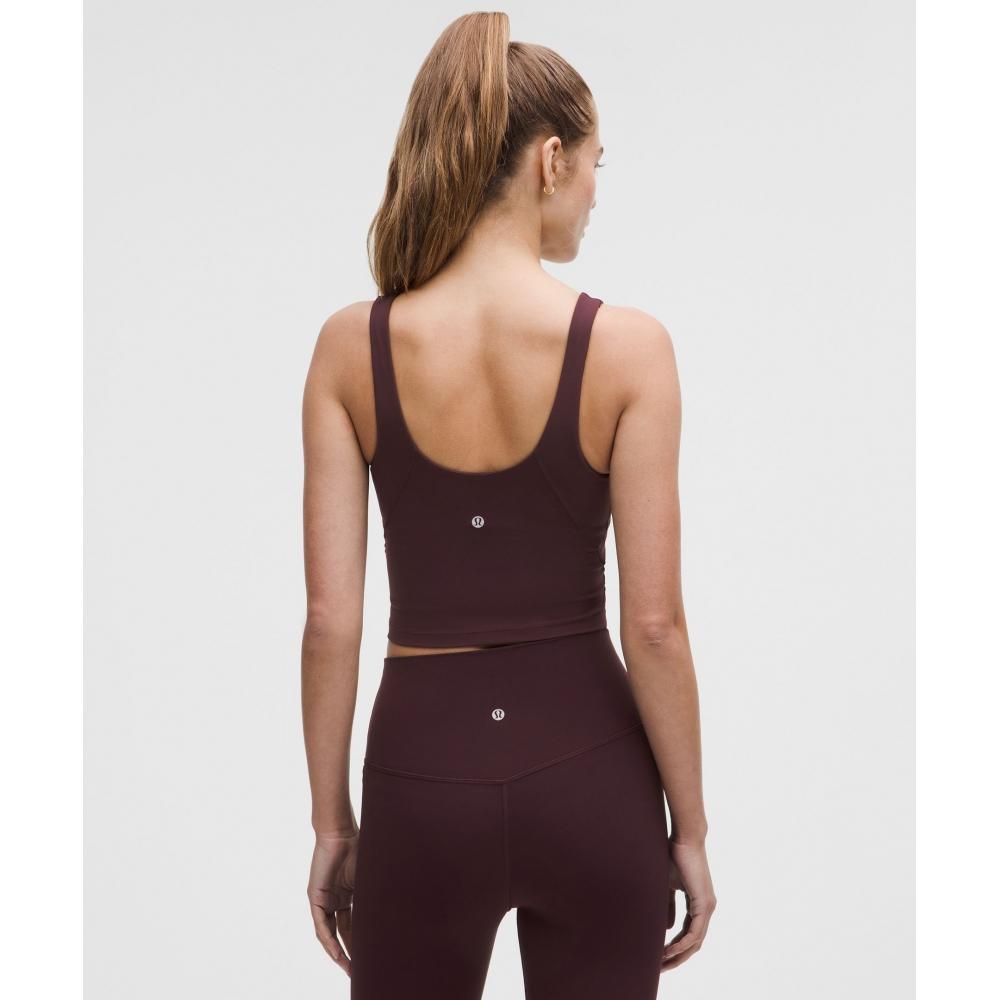 This tank top provides light support and fits A/B cups for sizes 0-14, while sizes 16-20 fit C/D cups. Its tight fit contours your body, and the cropped length is cut above the waist, making it perfect with high-rise pants. This product is intended for low-impact activities.