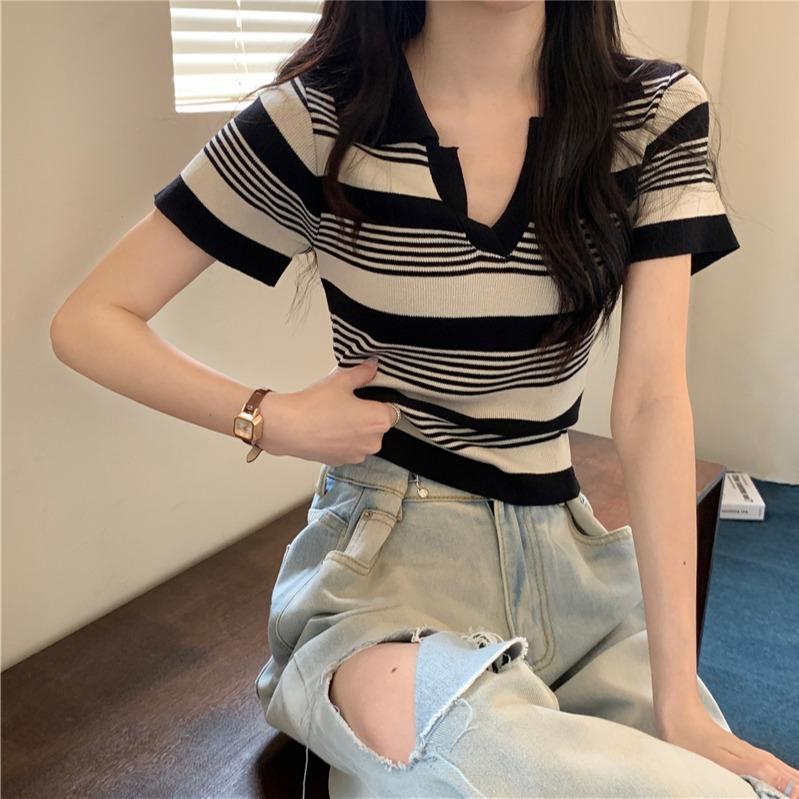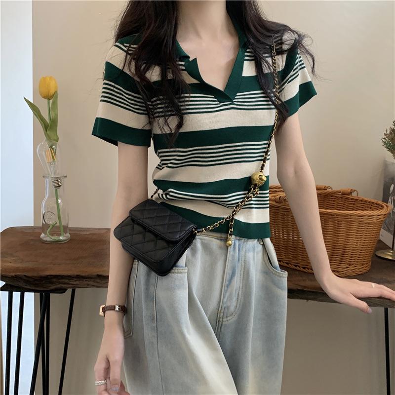 Трикотажная футболка с воротником поло с короткими рукавами для женщин, летняя, тонкая, новая, в полоску, популярная, короткая, студенческая, в тренде