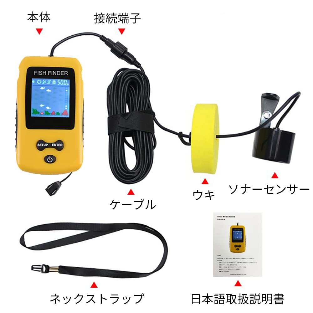 Прикрепленные элементы: Основной блок, датчик сонара с 9-метровым кабелем, адаптер-переходник, болт из нержавеющей стали, гайка-барашек из нержавеющей стали, шейный ремешок, инструкция на японском языке