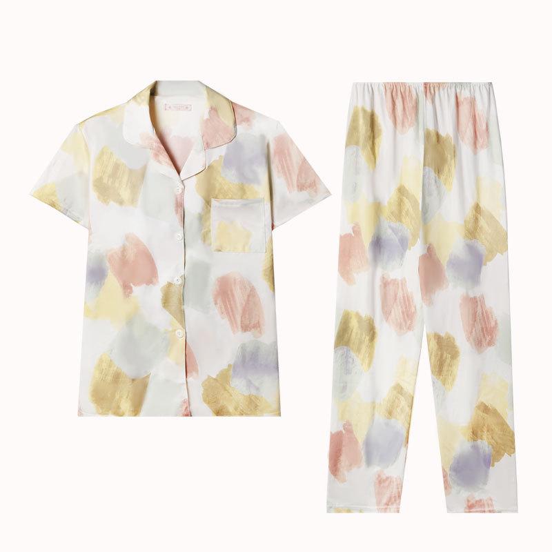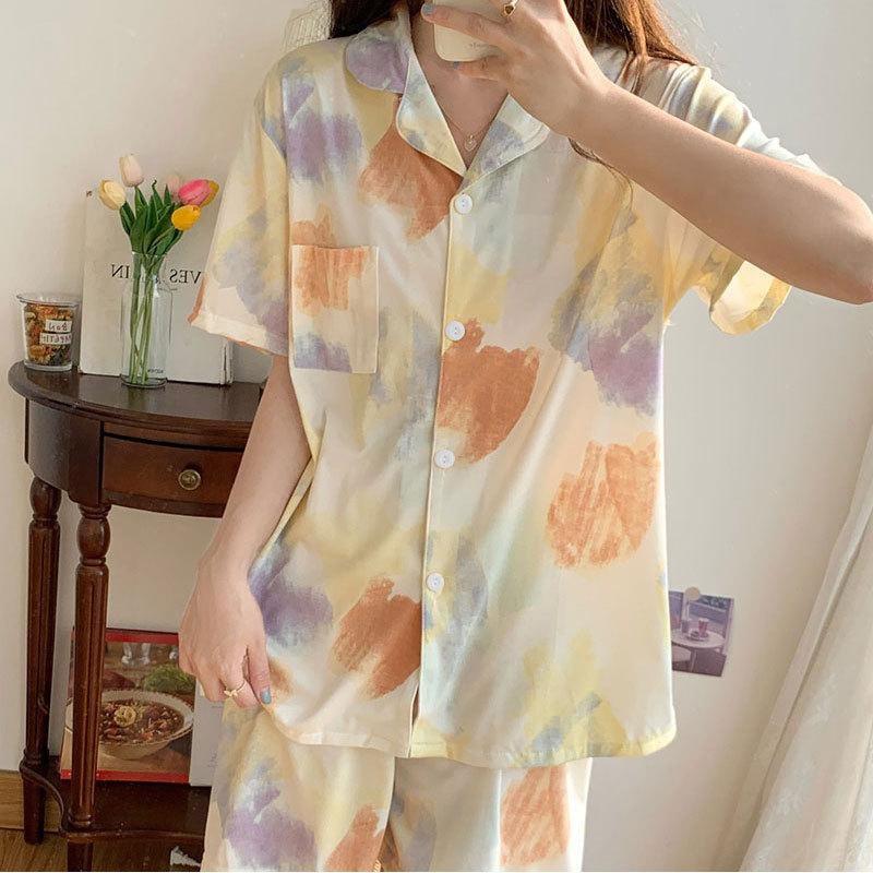 Женская пижама из двух частей с рисунком маслом Пижама Senior Sense для женщин с короткими рукавами, брюки, кардиган, домашняя одежда, летний тонкий костюм
