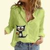 Женская мода хлопок льняная рубашка повседневный тонкий длинный рукав топ дамы кошачий принт застегивающаяся блузка