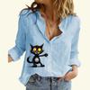 Женская мода хлопок льняная рубашка с принтом кота топ с длинным рукавом женская повседневная блузка на пуговицах