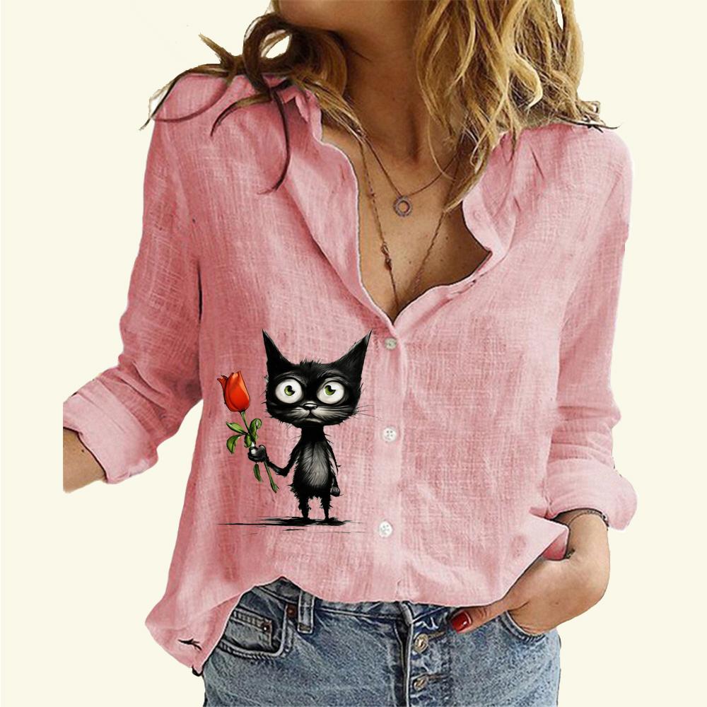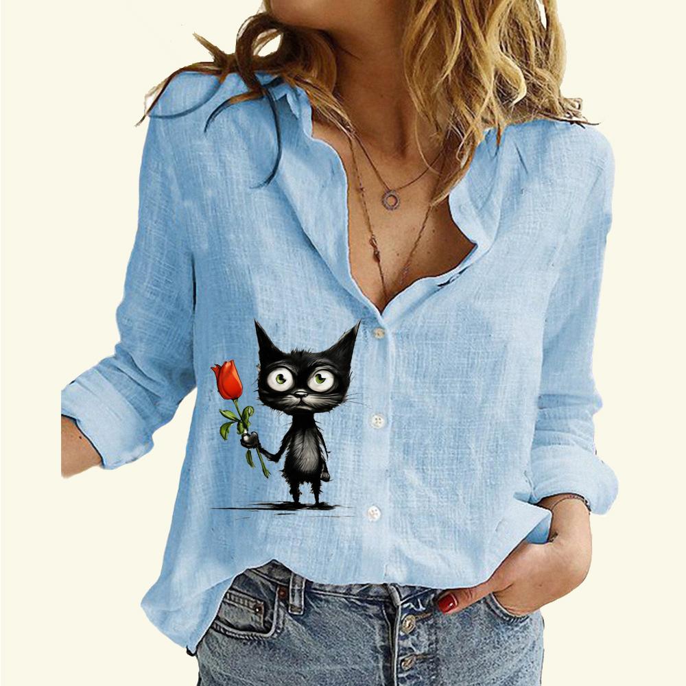 Женская мода хлопок льняная рубашка с принтом кота топ с длинным рукавом женская повседневная блузка на пуговицах