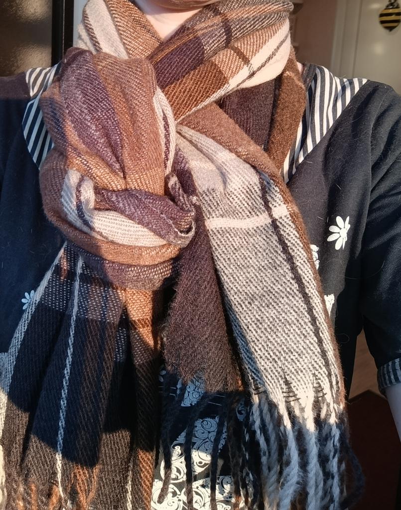 Был заявлен шарф с синими, бежевыми, светлокоричневыми клетками, пришел шарф с темнокоричневыми клетками. Конечно, кому нибудь подарю. Жаль что не то, что выбрала