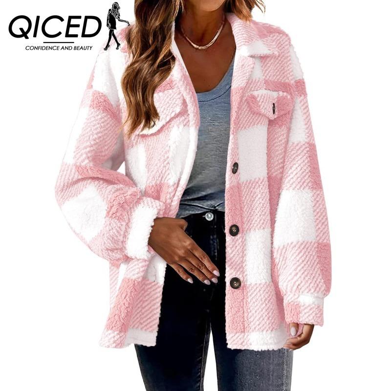 QICED Женская куртка осень-зима с карманами из овечьей шерсти в клетку, плюшевая куртка на пуговицах