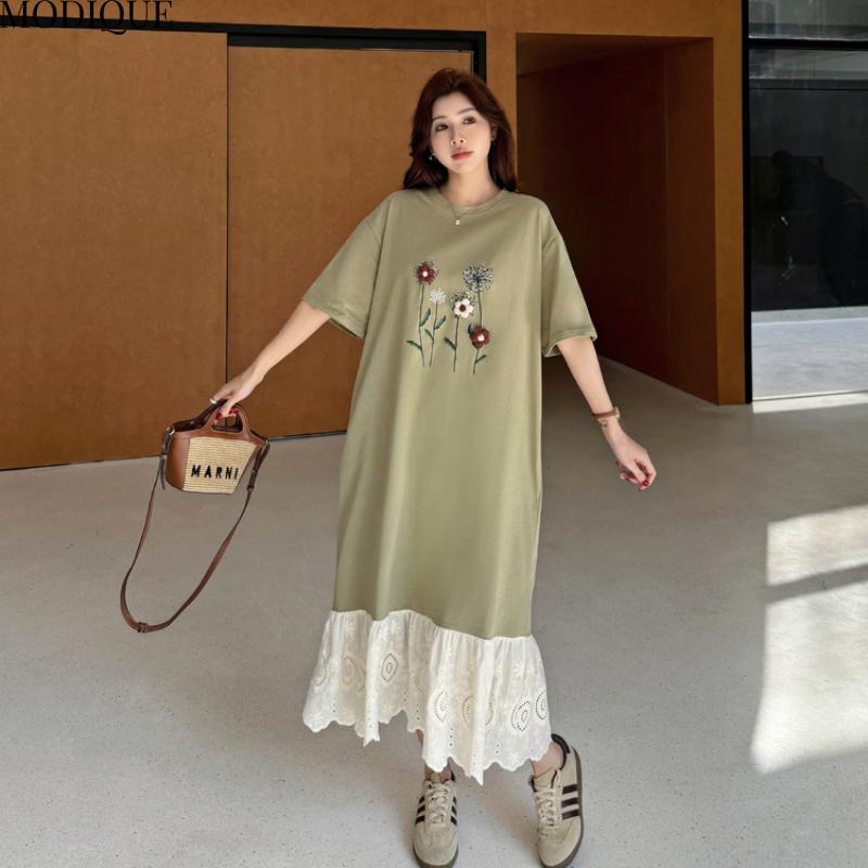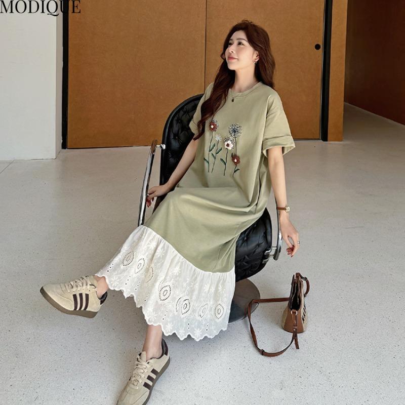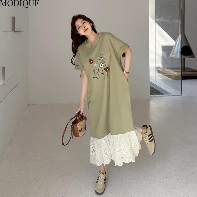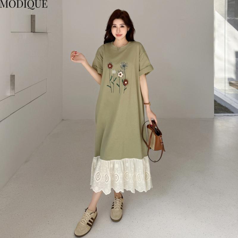 MODIQUE Летние платья больших размеров для женщин, свободные, с цветочным принтом, плиссированные, пэчворк, длинные платья, женские повседневные платья с коротким рукавом и круглым вырезом