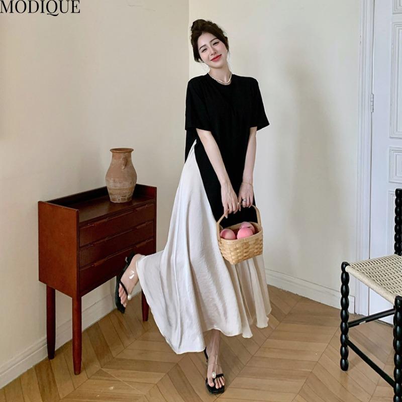 MODIQUE Летние платья больших размеров для женщин, свободные, элегантные, в тон, шелковые, пэчворк, длинные платья, женские, повседневные, с коротким рукавом и круглым вырезом — купить товар онлайн с бесплатной доставкой по всему миру!