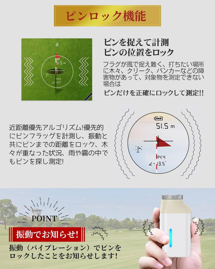 [Функция блокировки штифта и вибрационный сигнал] При измерении штифта с большого расстояния вы можете избежать ошибок измерения и точно нацелиться на цель, чтобы измерить расстояние, даже если на заднем плане штифта много деревьев или травы.. Он имеет высокую скорость измерения, быстро фиксирует флагшток и вибрирует при обнаружении объекта.. Даже во время обычных измерений вы получите уведомление с помощью вибрационного сигнала, что придаст вам уверенности в своих измерениях.