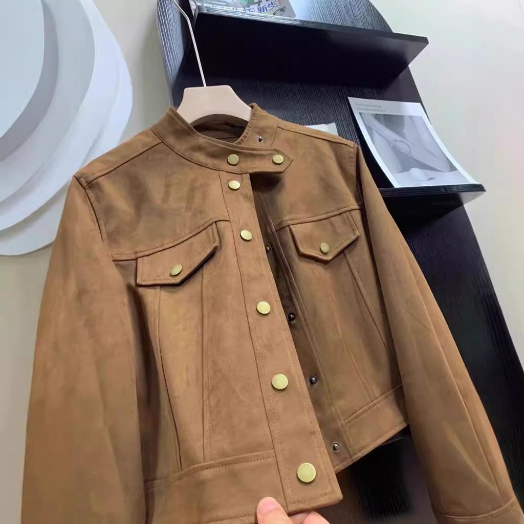 Женская весенне-осенняя американская винтажная кожаная куртка цвета кофе с узором «майяр» из замши Design Sense, короткая куртка для мотоциклистов