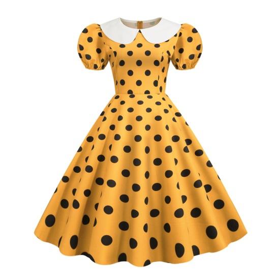 Подчеркните свой стиль с помощью этого шикарного женского платья с уникальным воротником-бэби-долл и очаровательными рукавами-буфами, придающими нотку элегантности.. Силуэт А-силуэта прекрасно дополняет вашу фигуру, а дизайн в горошек в стиле ретро с кукольным воротником, четко очерченной талией и широким подолом излучает классический шарм..