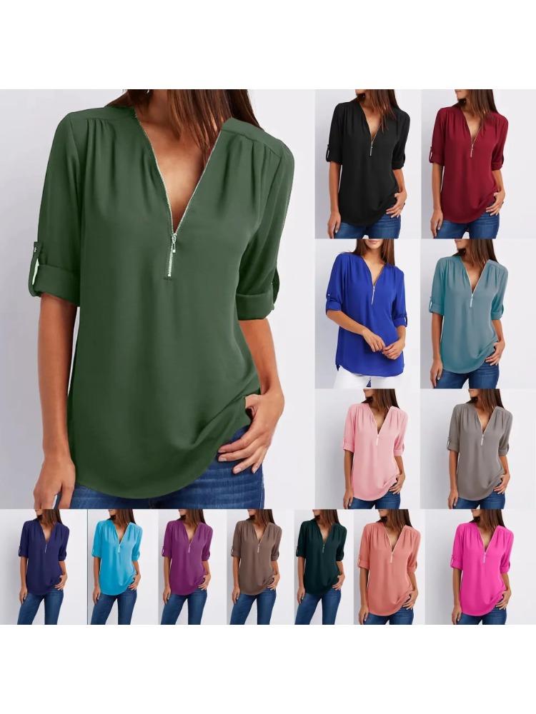 2025 Женская крутая свободная рубашка с глубоким V-образным вырезом, шифоновая модная блузка, повседневные женские топы, сексуальный пуловер на молнии, большие размеры — купить товар онлайн с бесплатной доставкой по всему миру!
