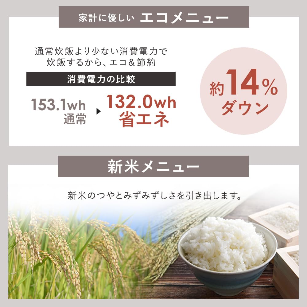 [Различные другие режимы/выборы курсов] - Бюджетный «Эко-режим»: Приготовление риса требует меньше энергии, чем при обычной варке риса, что делает процесс экологически чистым и экономичным.. ・Вкусный новый рис! «Новый режим риса»: Подчеркивает блеск и свежесть нового риса.. ・Рекомендуется для занятых людей! «Режим быстрого приготовления (*)”: Исключив время впитывания воды, еда будет приготовлена за более короткое время, чем обычное меню.. (*Время приготовления зависит от количества воды, температуры и сезона.. Рис разных сортов и рис нельзя готовить отдельно.)