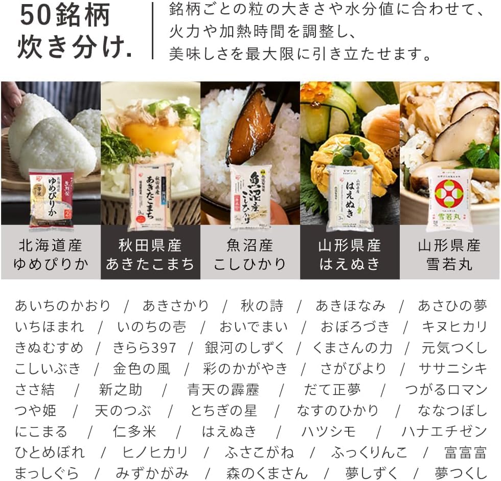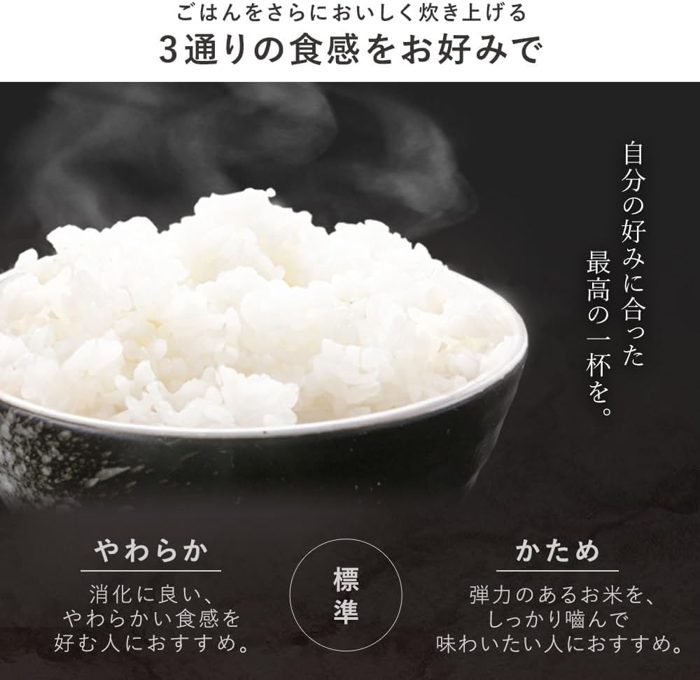 [Приготовлено в соответствии с 50 брендами] Мощность нагрева и время нагрева регулируются в зависимости от размера зерна и содержания влаги в каждом бренде, чтобы максимально раскрыть вкус.. [3 текстуры] Выберите одну из 3 текстур: мягкий/стандартный/жесткий.