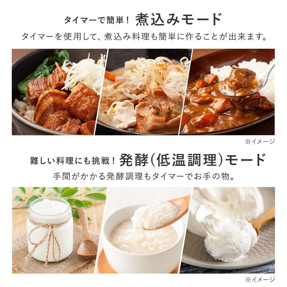 [Особенности микрокомпьютерной рисоварки RC-MDA] - Легкий «Режим тушения» с таймером: Используя таймер, вы можете легко приготовить тушеные блюда.. ・«Режим брожения» для сложных блюд: Даже трудоемкую ферментационную готовку можно выполнить с помощью таймера.